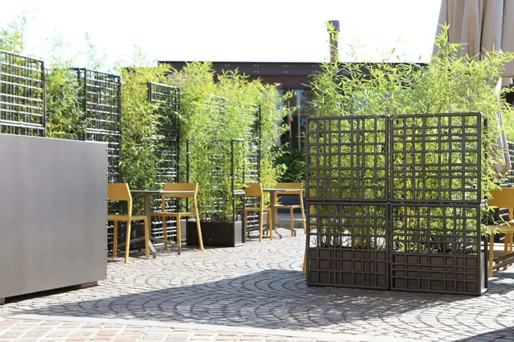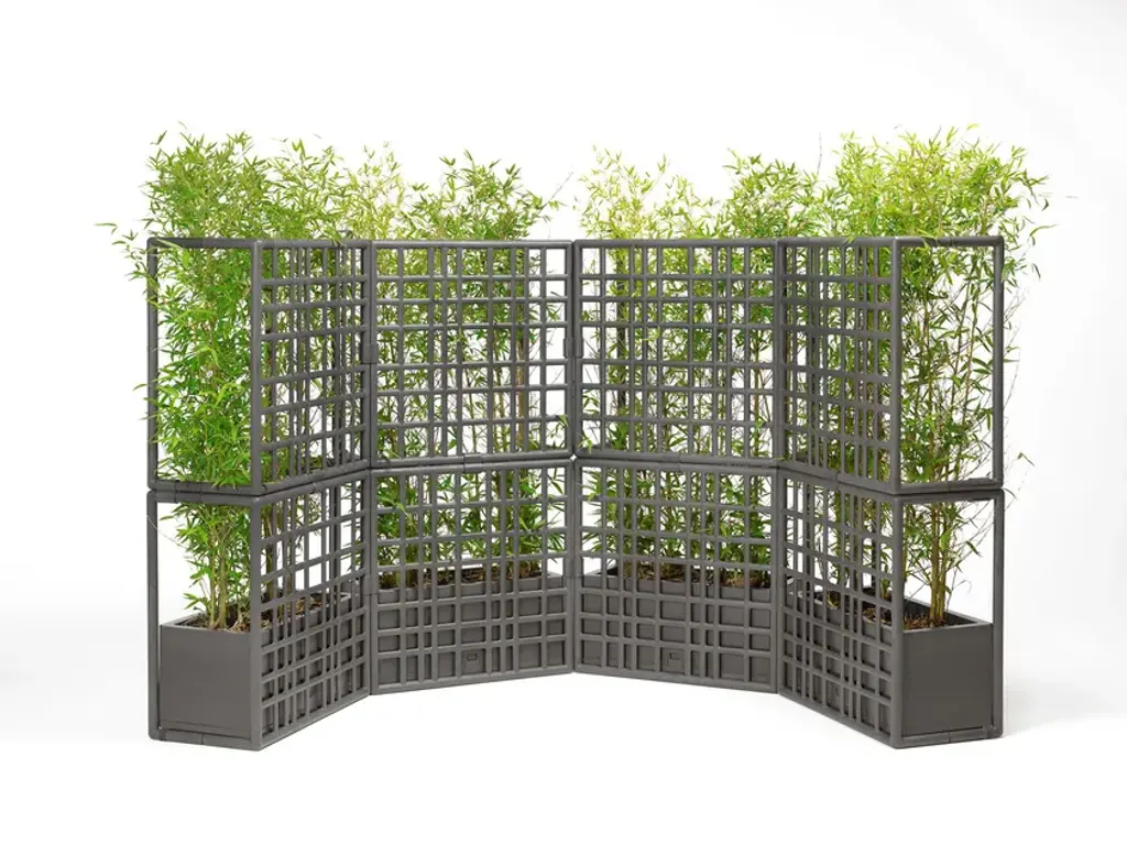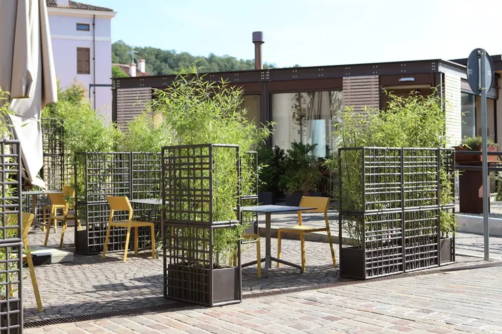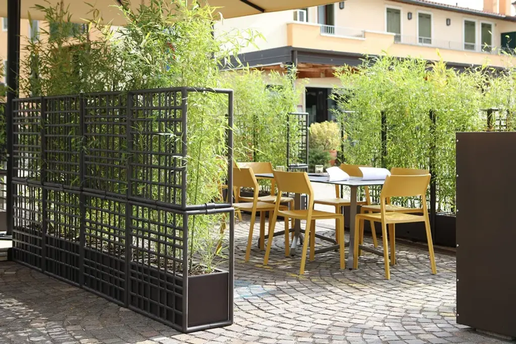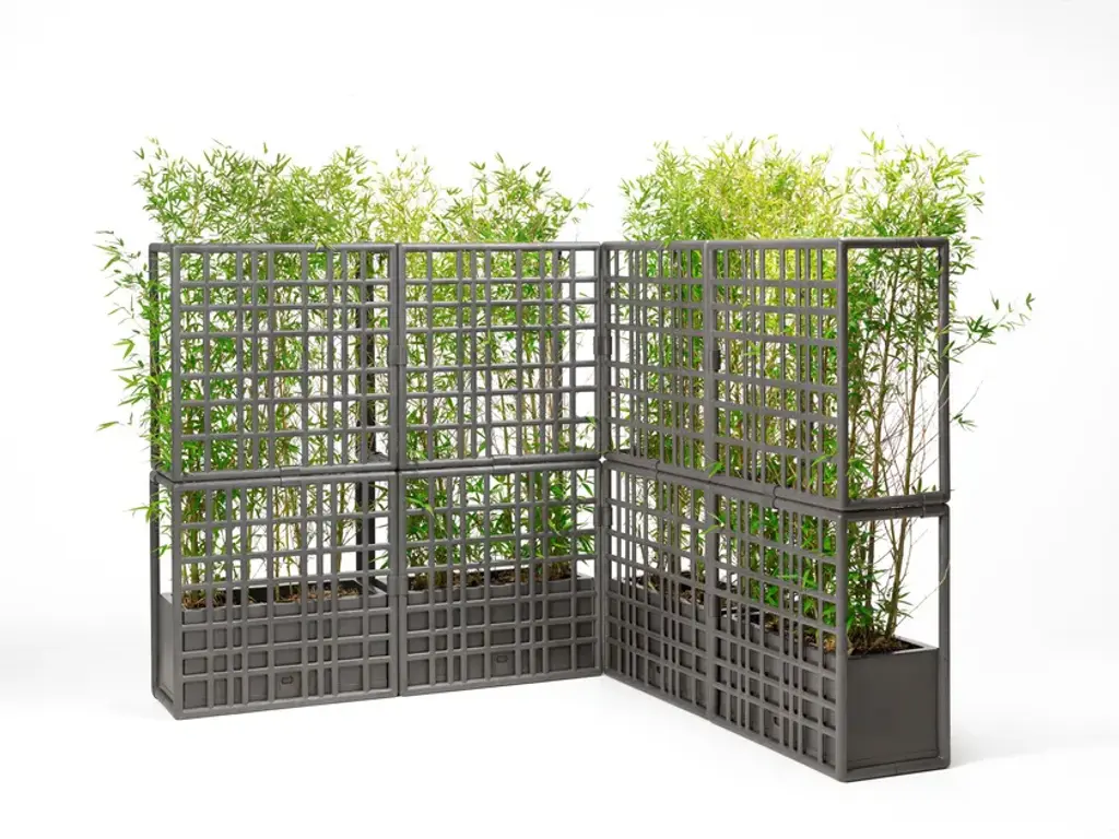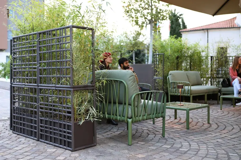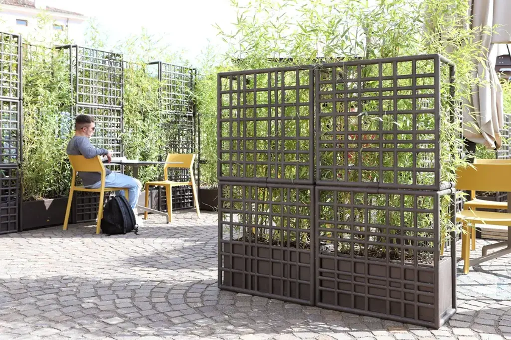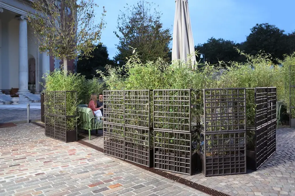 Modular outdoor partition made of recycled plastic. Sipario is a modular partition wall system with a planter for outdoor use made of regenerated plastic. It features an elegant asymmetrical wide mesh design. Depending on the positioning of the individual modules, it allows you to create various configurations and optical effects.Thanks to special snap-on hooks, it allows you to create walls in various shapes - linear, split, curved and closed - and modules can be assembled up to 3 metres (over 2 metres) in height.The Regeneration industrial programme by Nardi Sipario is the second product included in the catalogue arising from the Nardi Regeneration industrial programme which uses recycled plastic. It was created to meet the current requirement to separate the spaces of bars and restaurants, and to satisfy the ever-increasing need to live in an outdoor environment that is as natural as possible, also in urban contexts. Sipario coherently extends using a recycled and recyclable material with excellent physical and technical characteristics. It comes in 4 special colours – terra, gesso, basalto, cactus - with a matt finish.Smart solutions: self-watering pot, can be assembled/dismantled without screws, takes up little spaceThe modules are fitted with a special planter pot with a dual function: to make the partition walls heavier and to contain plants and flowers so that the separated spaces can be natural, private and elegant.Designed for the contract sector (but not only), the pot is self-watering, i.e. it has an 6,5-litre reservoir: water, poured through the hole at the top, flows into the plant-pot saucer and a special float indicates its level. It is very convenient and safe, since you do not need to tend to the plants every day; an essential feature for those who install it in a professional context.Sipario is easy to clean because it has no sharp edges. It can be easily assembled and stacked without having to use screws or tools. Once dismantled, it takes up very little space.PackagingThe protective packaging for Sipario is a box, with internal supports made of FSC-certified recycled cardboard, designed to minimise the use of the material.Inside, all the components of Sipario are protected with low-density polyethylene bags, a 100% recyclable material.Awards: Red Dot Award 2021 and Green Good Design Award 2021.