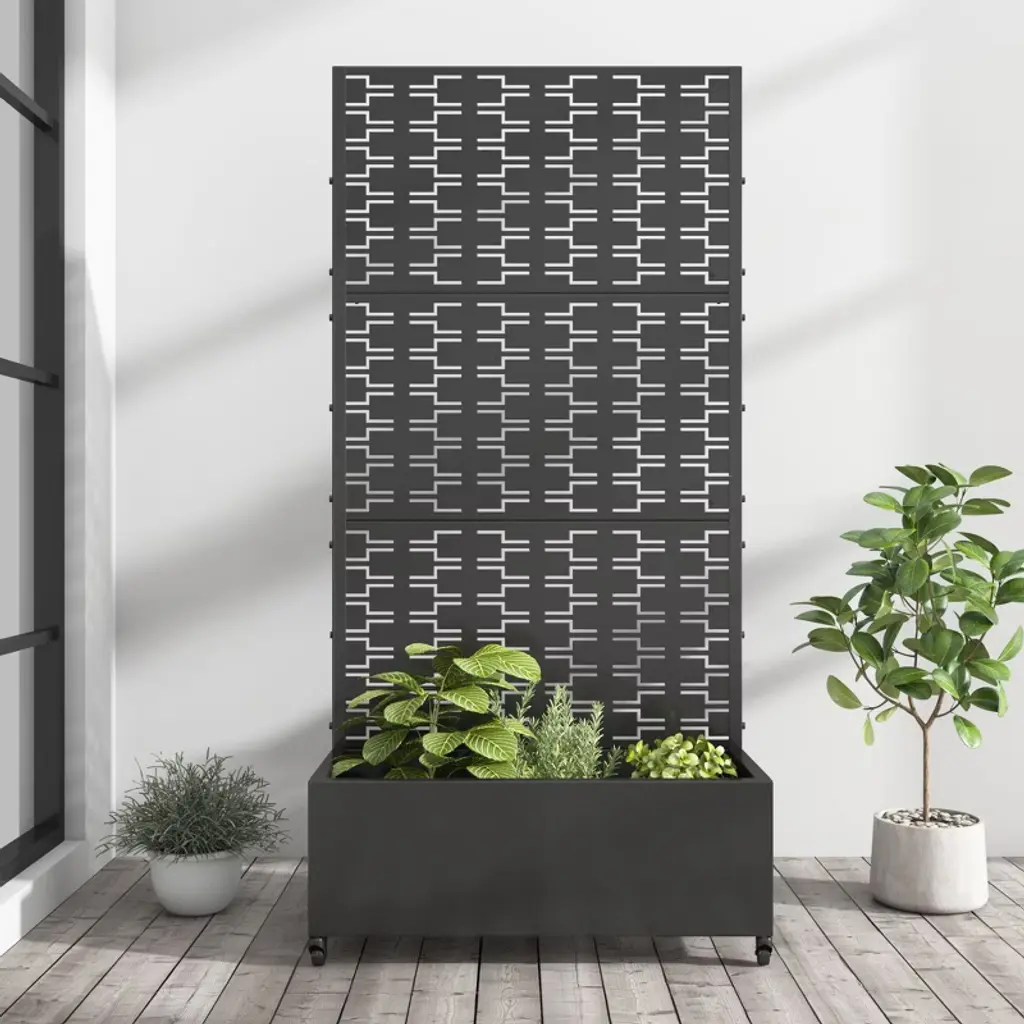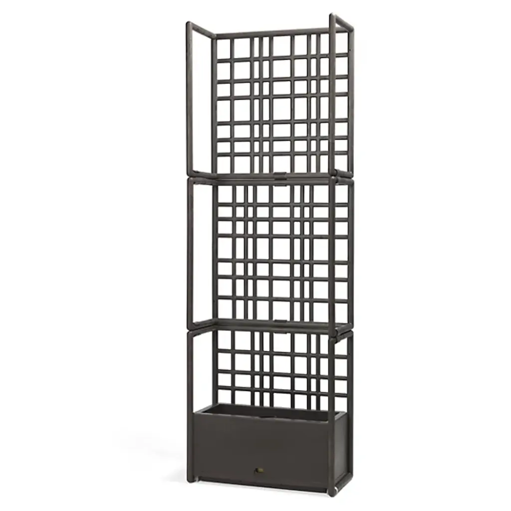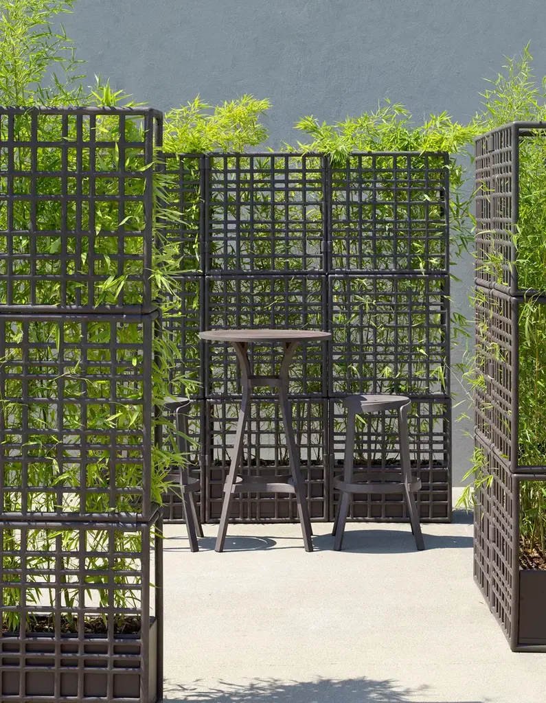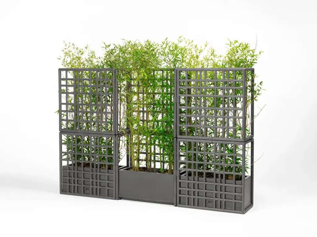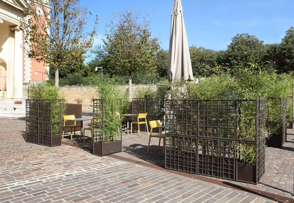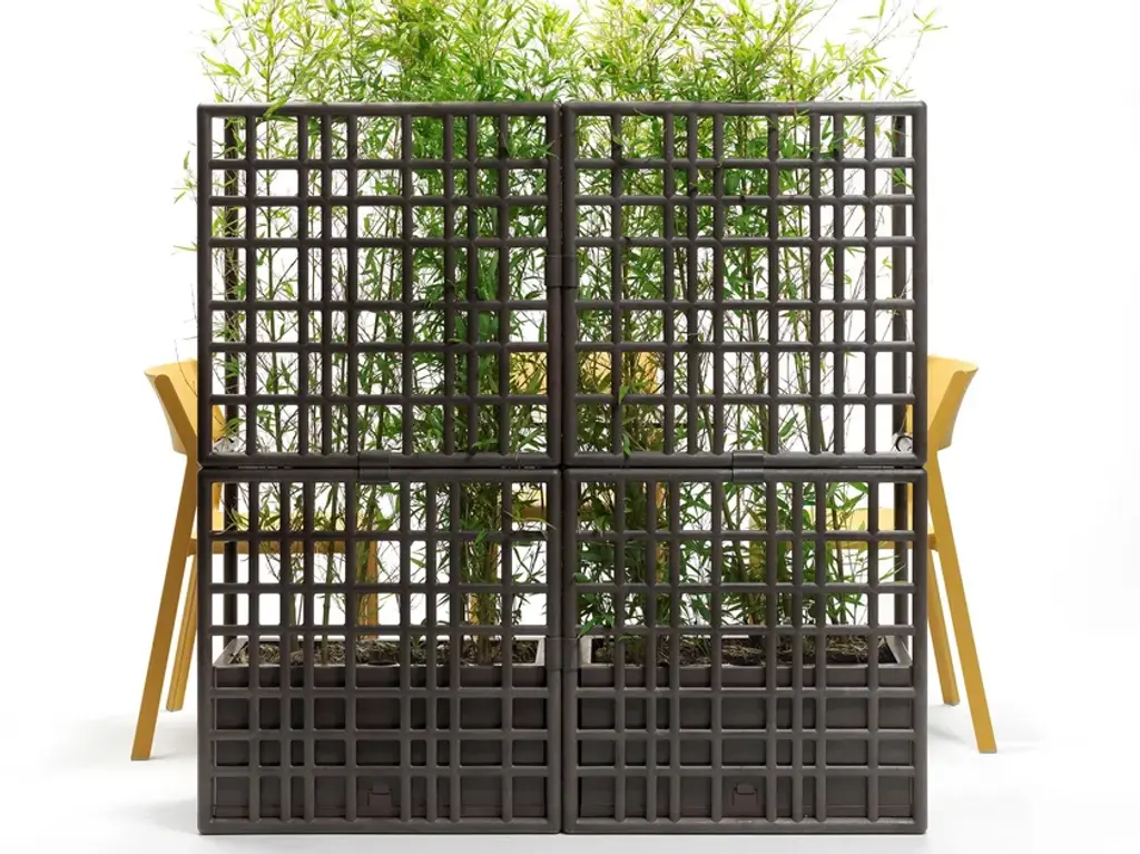 Modular outdoor partition made of recycled plastic. Sipario is a modular partition wall system with a planter for outdoor use made of regenerated plastic. It features an elegant asymmetrical wide mesh design. Depending on the positioning of the individual modules, it allows you to create various configurations and optical effects.Thanks to special snap-on hooks, it allows you to create walls in various shapes - linear, split, curved and closed - and modules can be assembled up to 3 metres (over 2 metres) in height.The Regeneration industrial programme by Nardi Sipario is the second product included in the catalogue arising from the Nardi Regeneration industrial programme which uses recycled plastic. It was created to meet the current requirement to separate the spaces of bars and restaurants, and to satisfy the ever-increasing need to live in an outdoor environment that is as natural as possible, also in urban contexts. Sipario coherently extends using a recycled and recyclable material with excellent physical and technical characteristics. It comes in 4 special colours – terra, gesso, basalto, cactus - with a matt finish.Smart solutions: self-watering pot, can be assembled/dismantled without screws, takes up little spaceThe modules are fitted with a special planter pot with a dual function: to make the partition walls heavier and to contain plants and flowers so that the separated spaces can be natural, private and elegant.Designed for the contract sector (but not only), the pot is self-watering, i.e. it has an 6,5-litre reservoir: water, poured through the hole at the top, flows into the plant-pot saucer and a special float indicates its level. It is very convenient and safe, since you do not need to tend to the plants every day; an essential feature for those who install it in a professional context.Sipario is easy to clean because it has no sharp edges. It can be easily assembled and stacked without having to use screws or tools. Once dismantled, it takes up very little space.PackagingThe protective packaging for Sipario is a box, with internal supports made of FSC-certified recycled cardboard, designed to minimise the use of the material.Inside, all the components of Sipario are protected with low-density polyethylene bags, a 100% recyclable material.Awards: Red Dot Award 2021 and Green Good Design Award 2021.