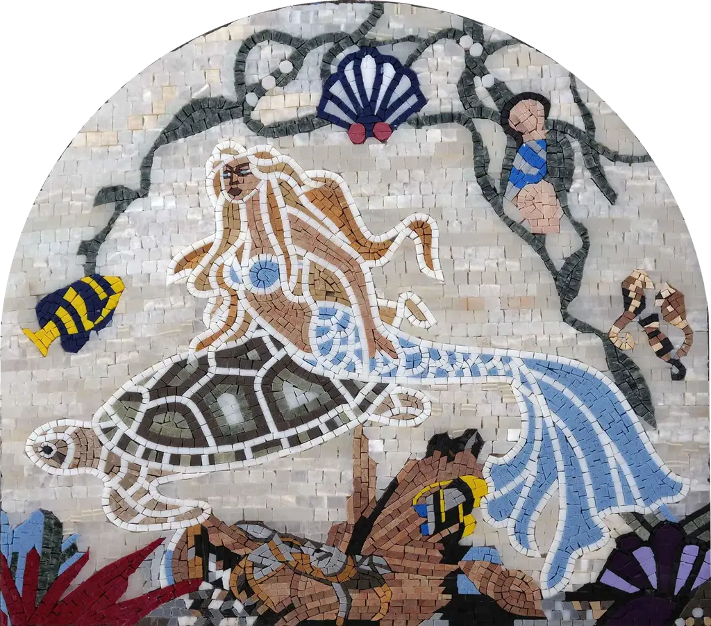 Immerse yourself in the enchanting depths with this captivating mosaic. A graceful mermaid, adorned with delicate wings, plays a shimmering harp amidst a vibrant coral reef. The intricate details and rich blues evoke a sense of underwater magic and musical tranquility.