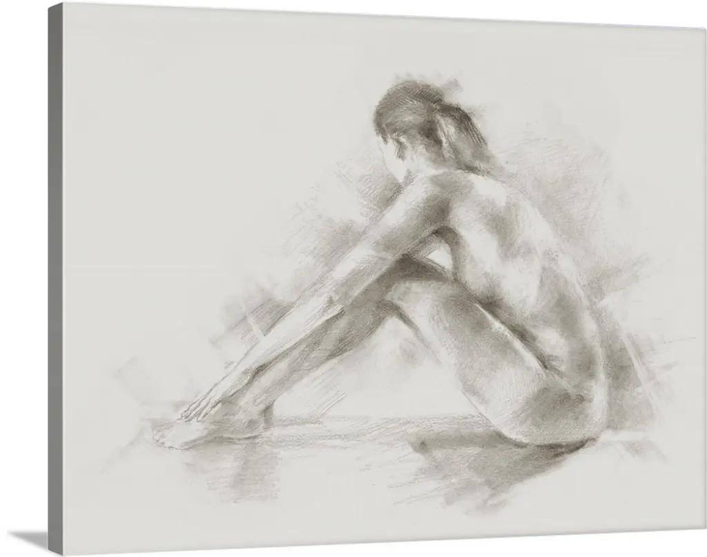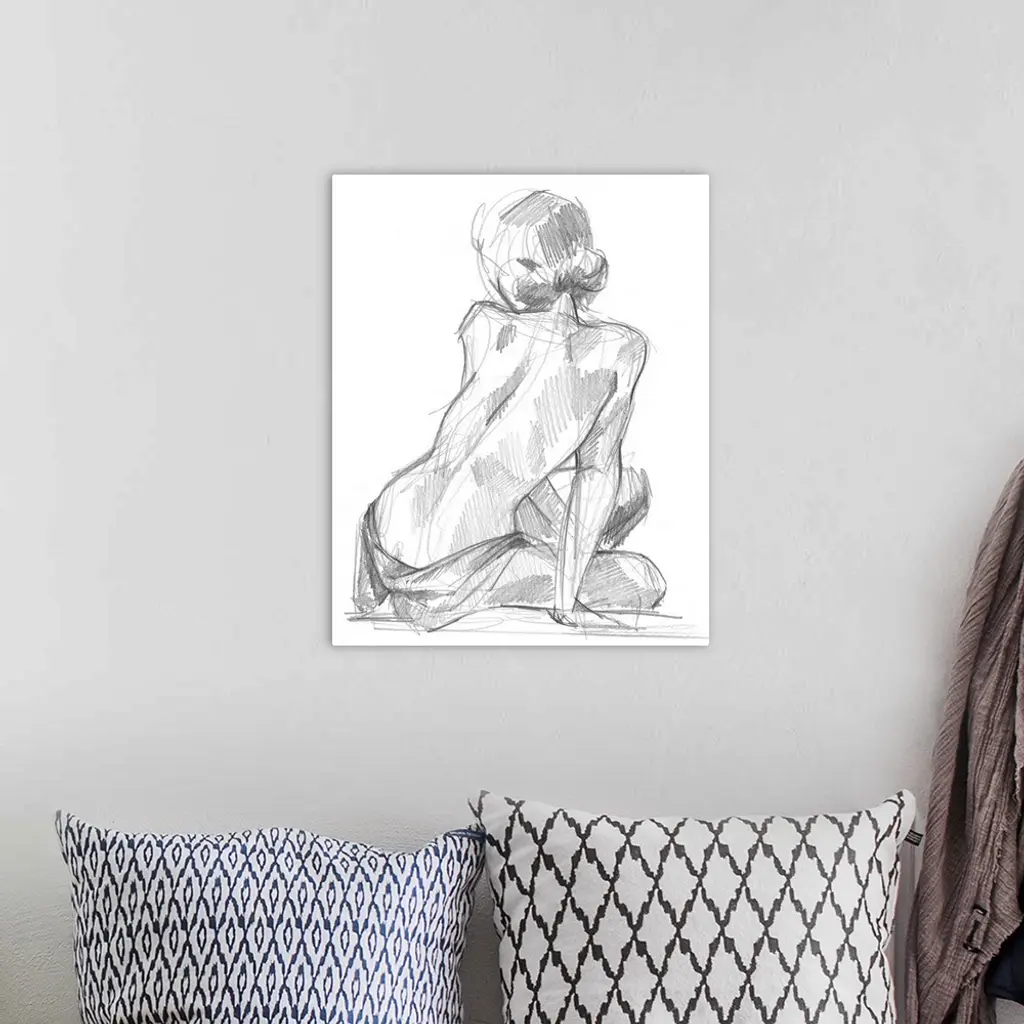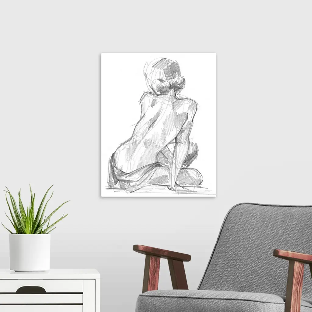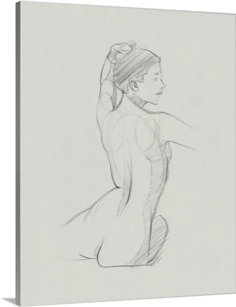 Drawing of the back of a nude woman looking over her shoulder on a white background.