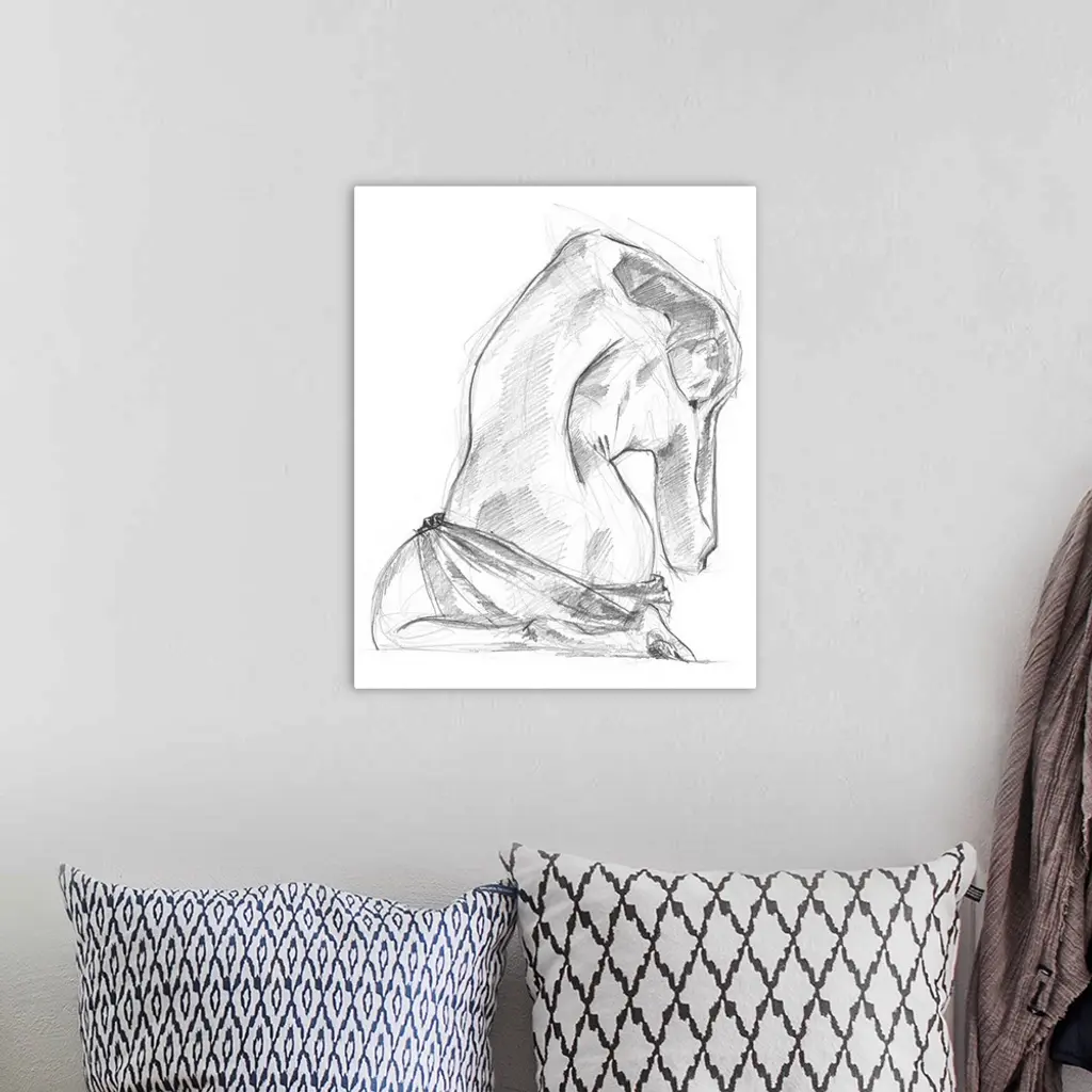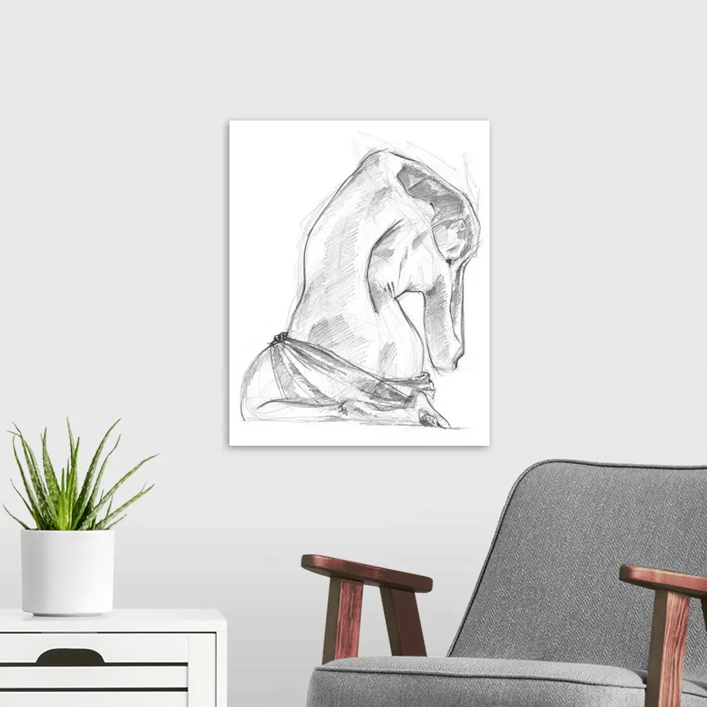 Drawing of the back of a nude woman looking over her shoulder on a white background.