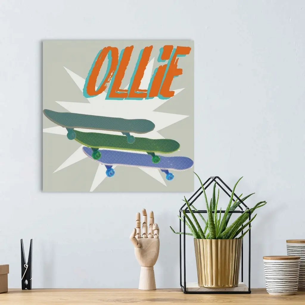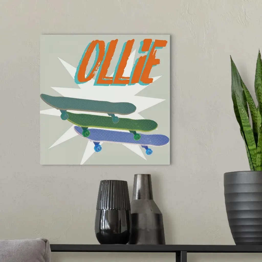 A youthful design of layered group of skateboards below "Ollie" on a starburst gray background.