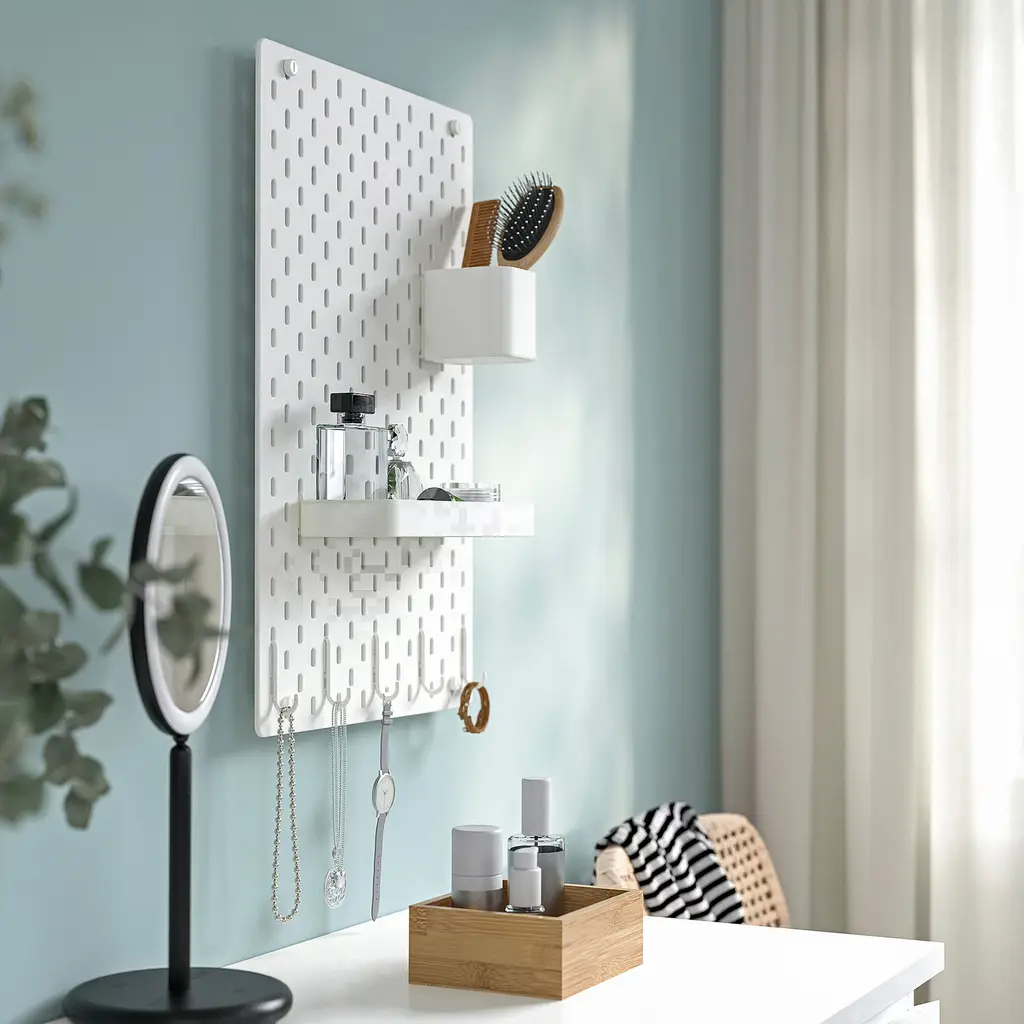 SKÅDIS Pegboard combination - white 14 ¼x22 ". With SKÅDIS pegboard and accessories it's easy to organize all the rooms of the home and quickly find what you need. The accessories are easy to attach anywhere on the pegboard and easy to move when you like - no tools needed.