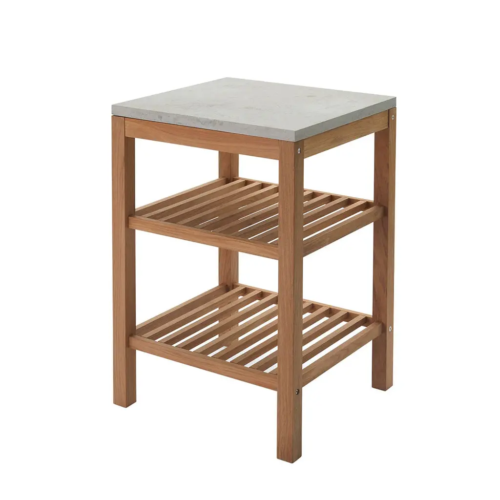 Pantry Module is a versatile work station designed to help out right next to your grill our greenhouse or inside your kitchen. With its two shelves and practical steel tubes on both sides, Pantry offers an exceptional storage opportunity with plenty of space for both kitchen utensils, crafting tools or pots and soil. The table top itself is made from hardwearing fiber-reinforced concrete while the frame is crafted in teak wood.