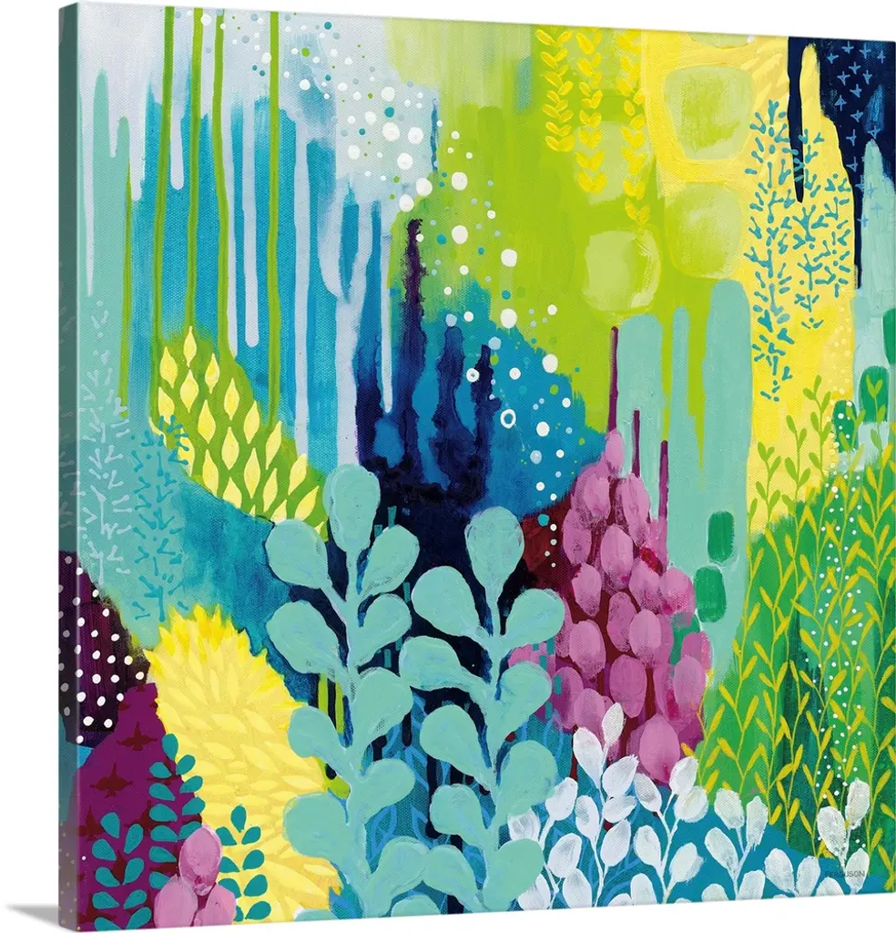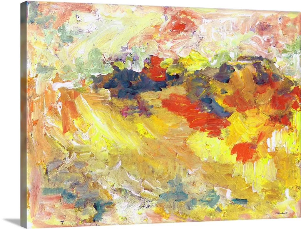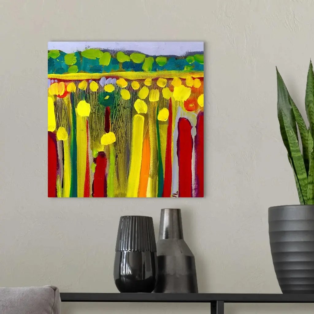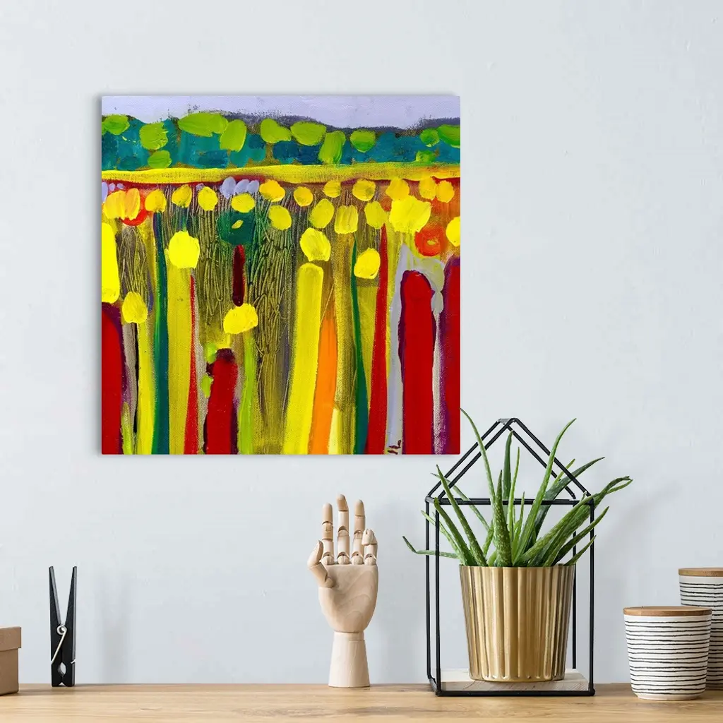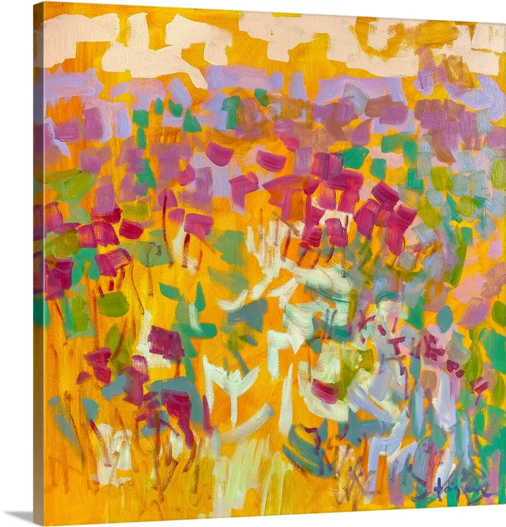 Large contemporary art depicts an open field of flowers in the foreground contrasted by rolling hills bordered by a tree line in the background. Artist uses minimal detail and an abundance of lighter warm tones throughout this entire piece.