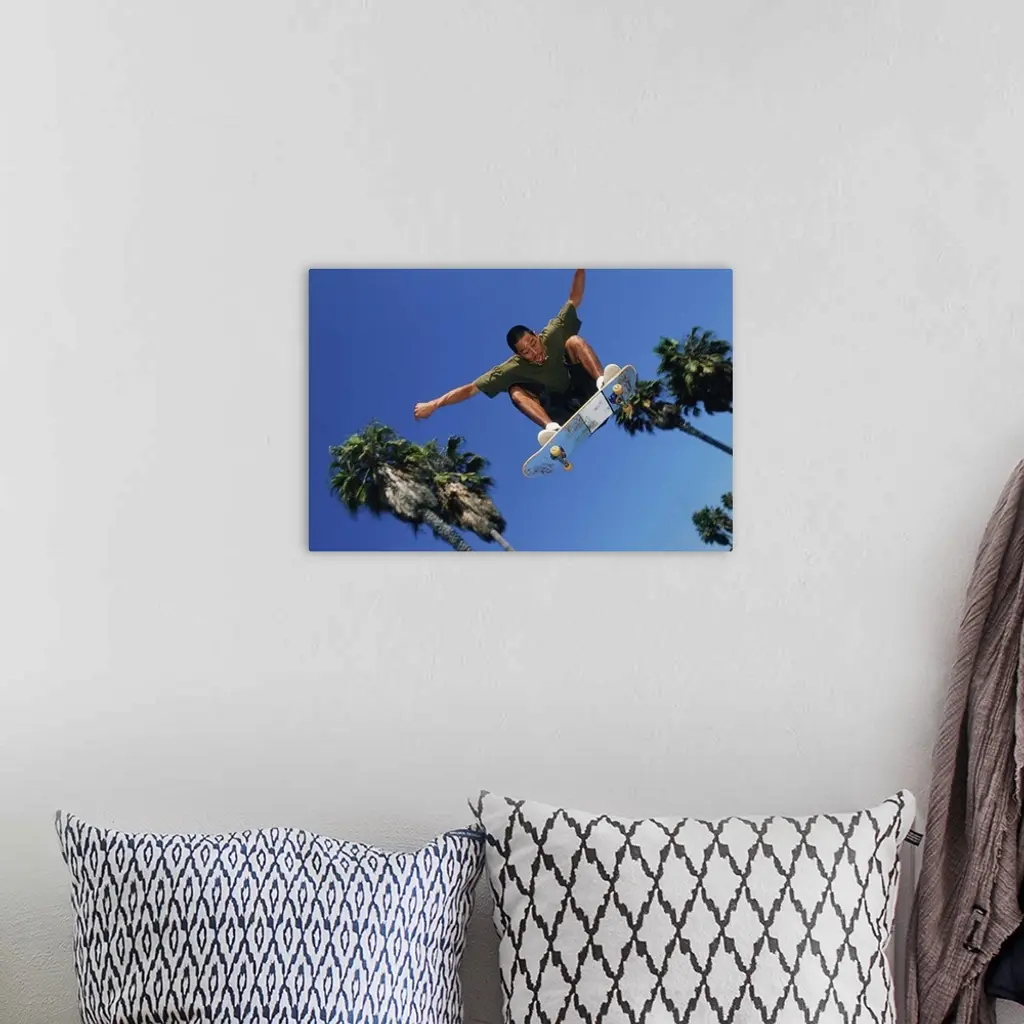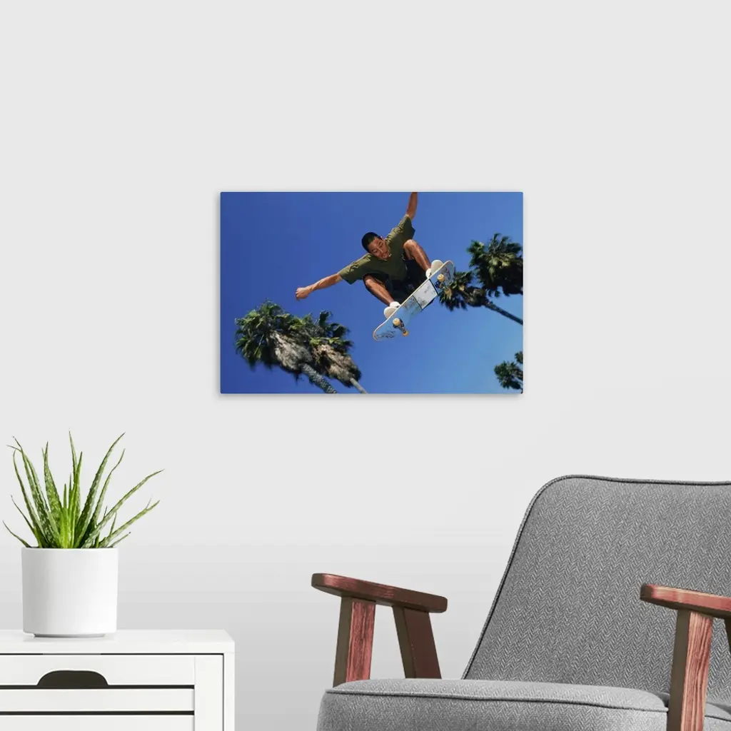 Skateboarder in mid-jump, low angle view wall art for home and office decor. Discover canvas art prints, photos, mural, big canvas art and framed wall art in GreatBigCanvas.com's varied collections.