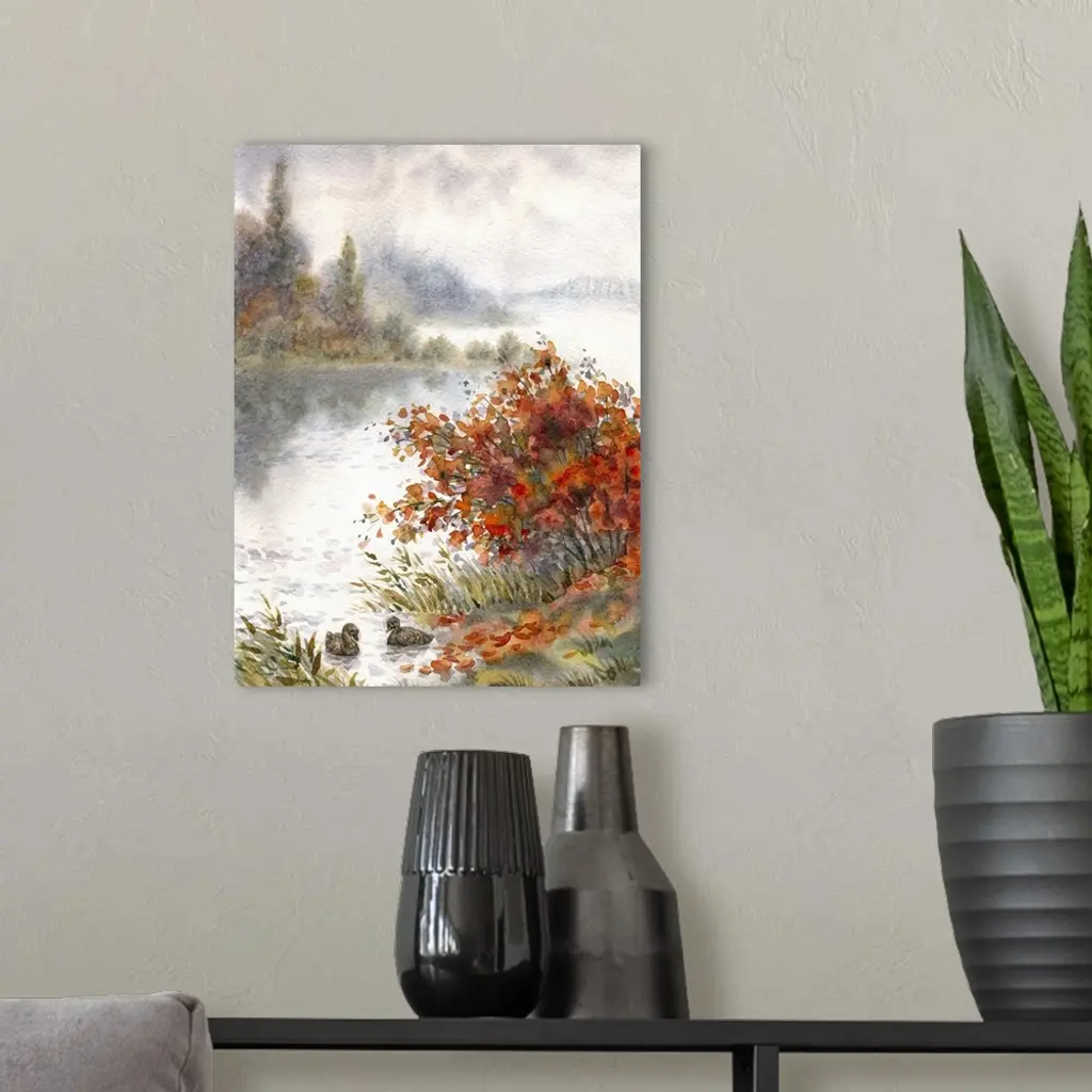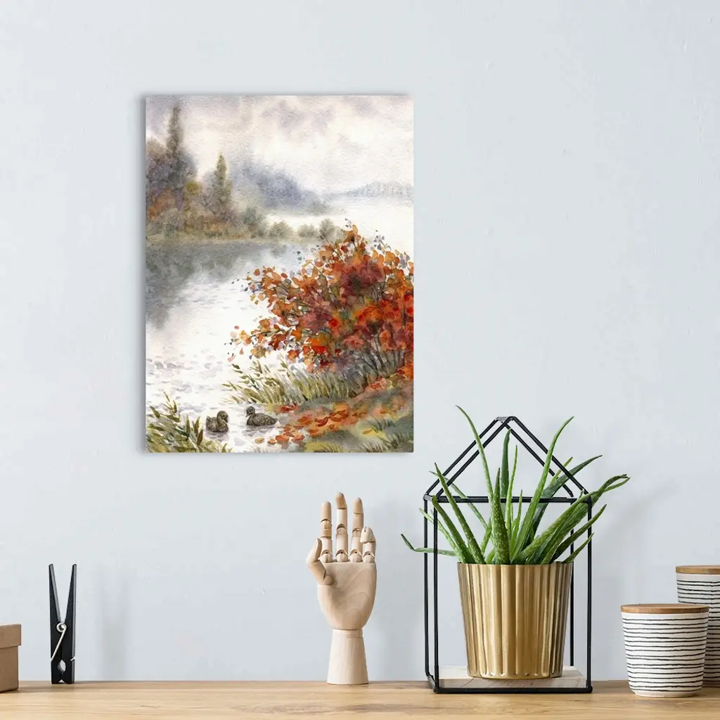 Watercolor landscape of an autumn lake with a pair of ducks behind a bush on the shore.