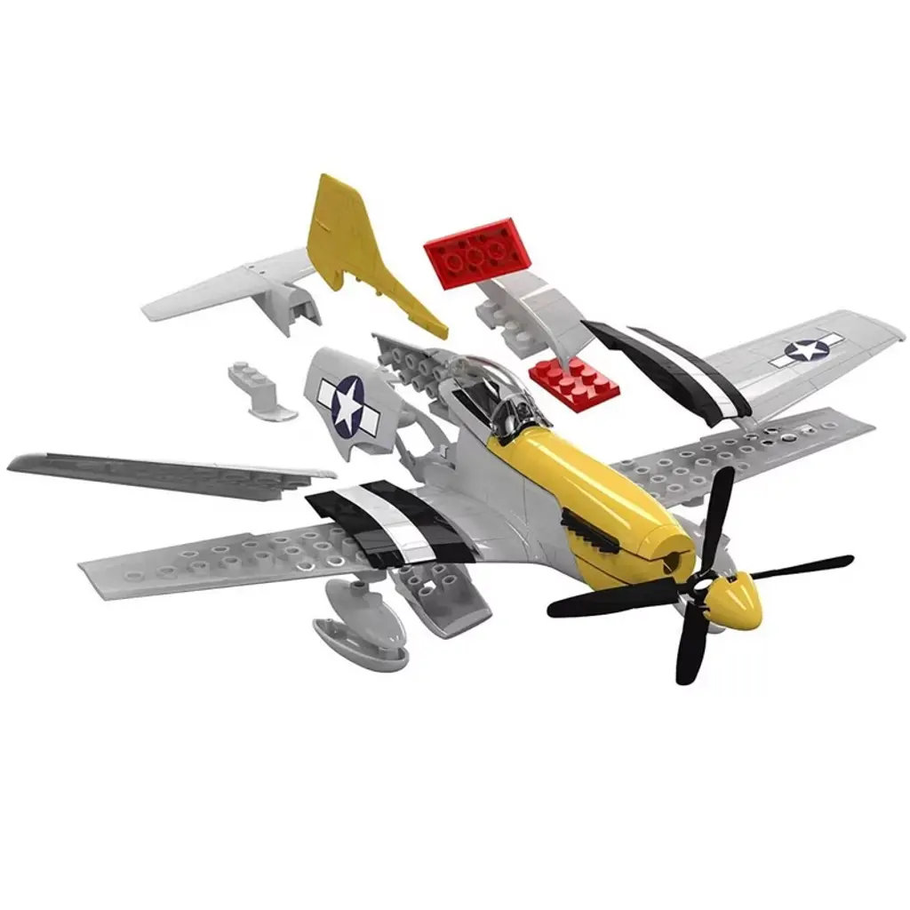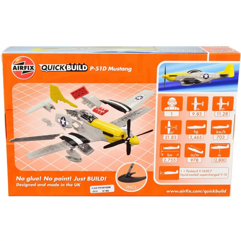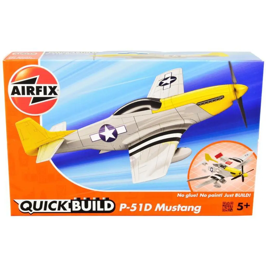 Brand new P-51D- Mustang Snap Together (Skill 1) Painted Plastic Model Airplane Kit by Airfix Quickbuild. Brand new box. Includes 38 parts. Highly detailed model kit. Detailed interior, exterior. Officially licensed product. Self-adhesive stickers are included. A plastic display stand is included. This item does not have openings. No glue or paint is required. Just build. Approximate dimensions: Length-8.4, Width-9.5 inches. ABOUT: Airfix QUICK BUILD is an exciting range of brick-based models suitable as an introduction to modeling for any age of 6 and up. The pre-colored pieces simply push together to build an impressive model which can then be decorated with the included self-adhesive stickers. No paint or glue is needed to make these fantastic models look like the real thing, and once completed there's no evidence of any of the brick fittings showing. When built they are tough enough to be used as toys, or smart enough to use as display models. Either will show off those great modeling skills! Included with each model are a full set of easy-to-follow color instructions, free-rolling wheels for cars and tanks, and display stands for all aircraft.