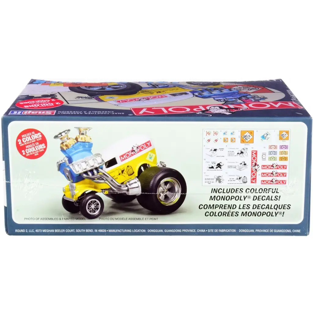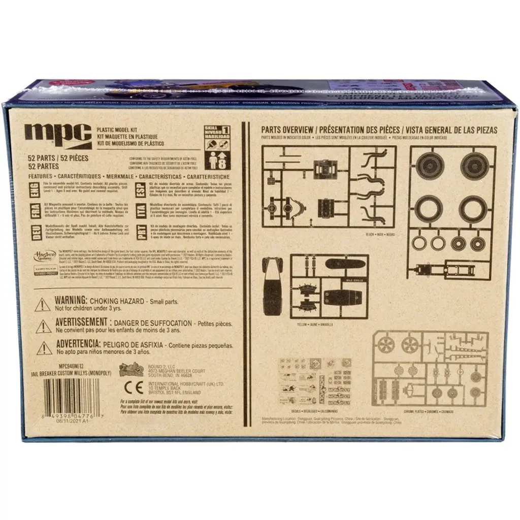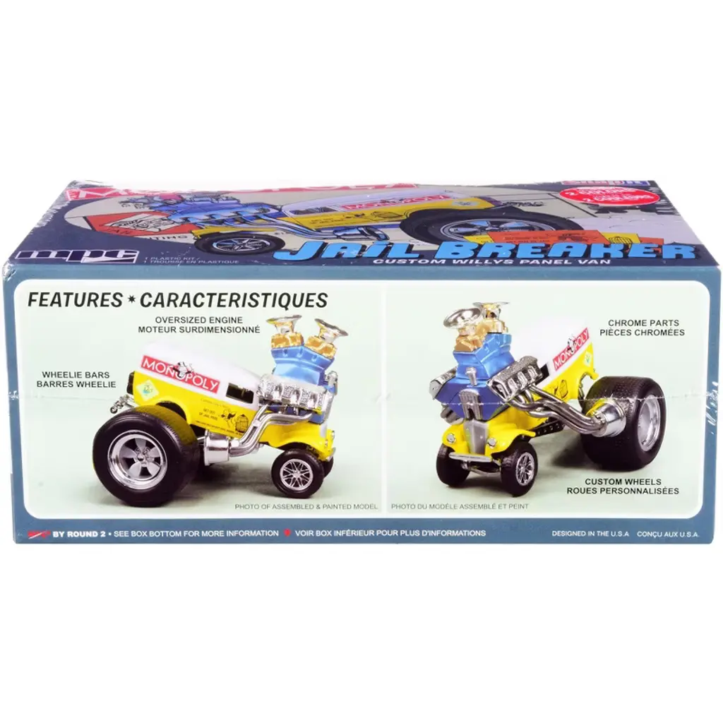 Brand new 1/25 scale plastic snap model kit of Custom Willys Panel Van Jail Breaker "Monopoly" (Skill 1) 1/25 plastic snap model kit by MPC. Brand new box. Wheelie bars. Chrome parts. Snaps together. Custom wheels. Oversized engine. Vintage style packaging. Officially licensed product. Chrome plated small parts. No paint or glue required. More than 52 detailed parts. Includes colorful "Monopoly" decals. Suitable for the beginner or experienced modeler. Parts molded in two colors YELLOW and BLACK, unless otherwise indicated.