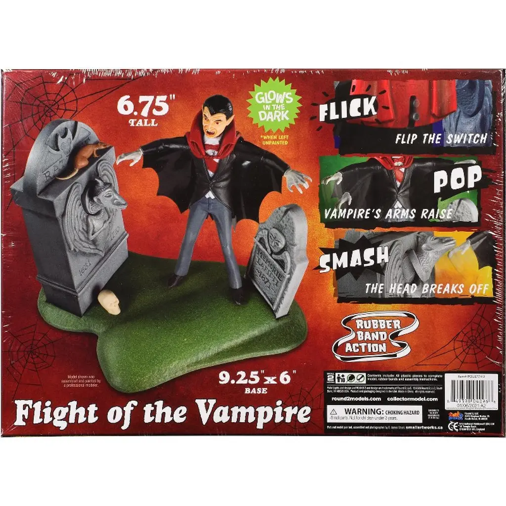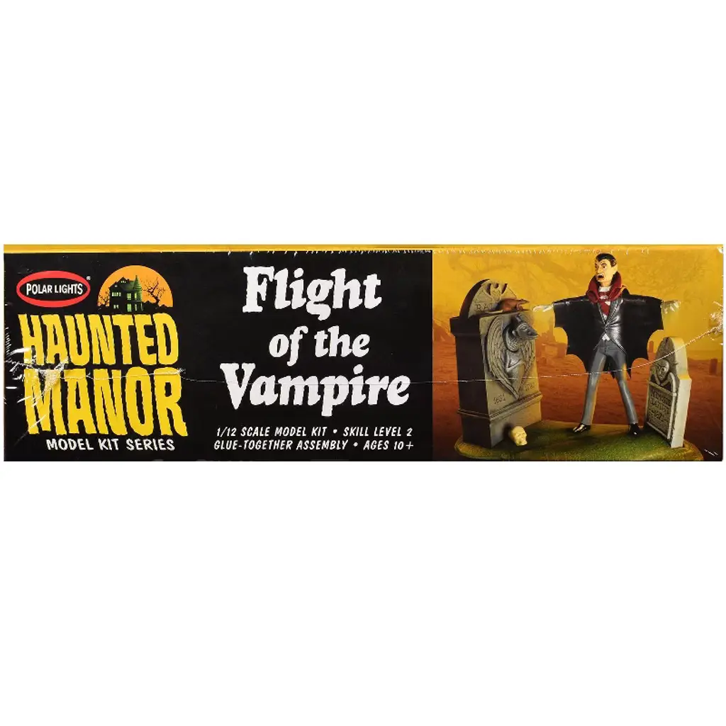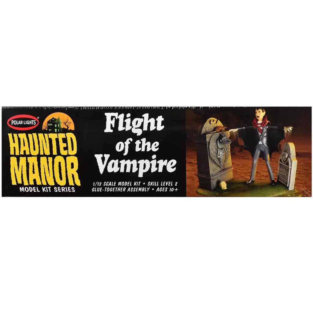 Brand new plastic model kit of Haunted Manor "Flight of the Vampire" Diorama Set (Skill 2) 1/12 plastic model kit by Polar Lights. Brand new box. Rubber band action. Glue-together assembly. Vintage style packaging. Officially licensed product. Contains 26 detailed parts. Base measures at 9.25 by 6 inches. Glows in the dark when left unpainted. Assembled model stands at 6.75 inches tall. Paint and cement required (not included). Manufacturer's original unopened packaging. Parts molded in GLOW IN THE DARK PLASTIC, unless otherwise indicated.