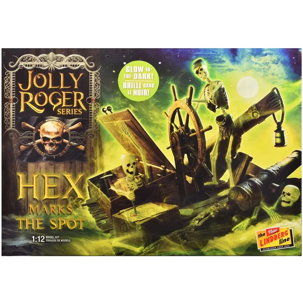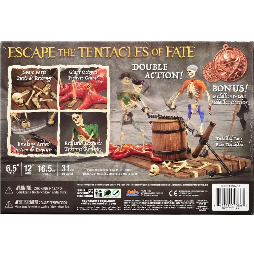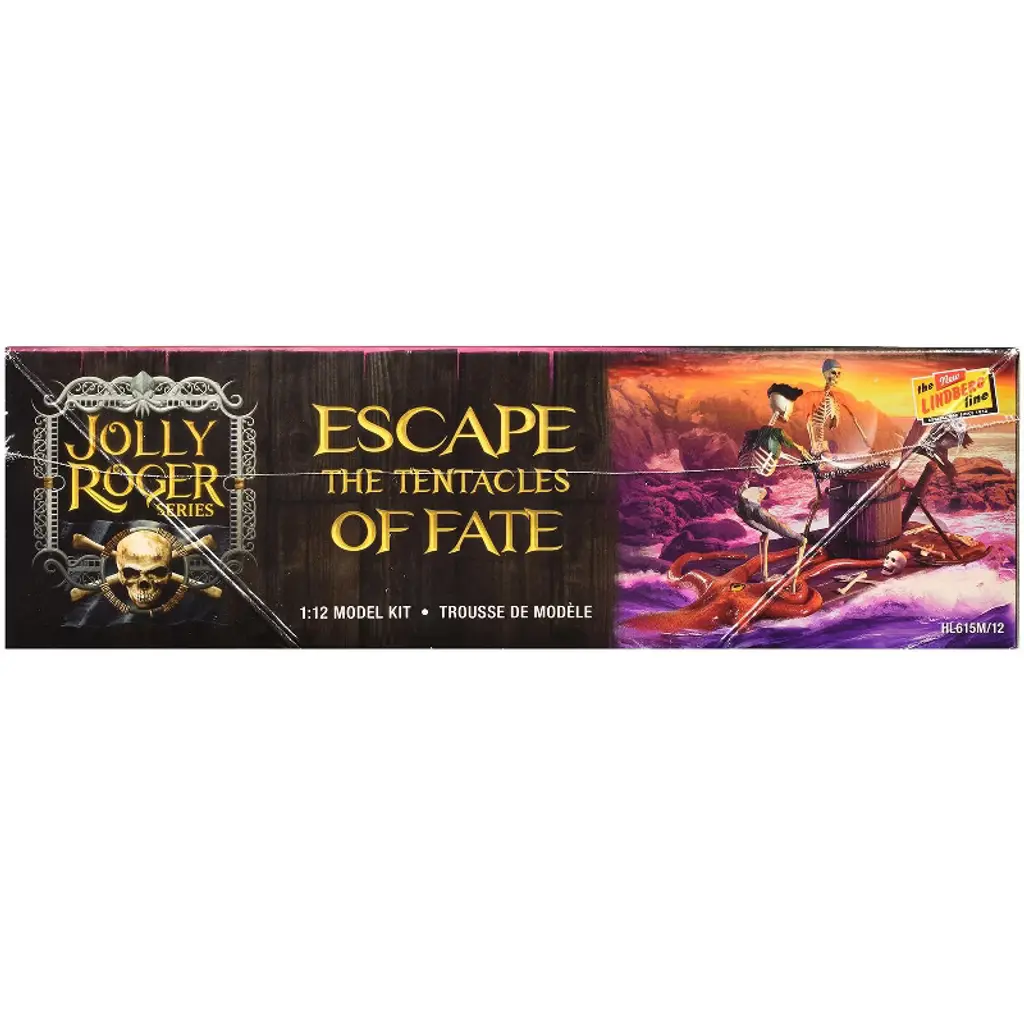Brand new plastic model kit of Jolly Roger Series "Escape the Tentacles of Fate" Diorama Set (Skill 2) 1/12 plastic model kit by Lindberg. Brand new box. Realistic textures. Rubber band action. Vintage style packaging. Officially licensed product. Contains 50+ detailed parts. Glows in the dark when left unpainted. Assembled model stands at 6.5 inches tall. Detailed Base measures at 12 by 6 inches. Paint and cement required (not included). Manufacturer's original unopened packaging. Includes 2 skeleton figures, spare parts, giant octopus, and more. Parts molded in GLOW IN THE DARK PLASTIC, unless otherwise indicated.