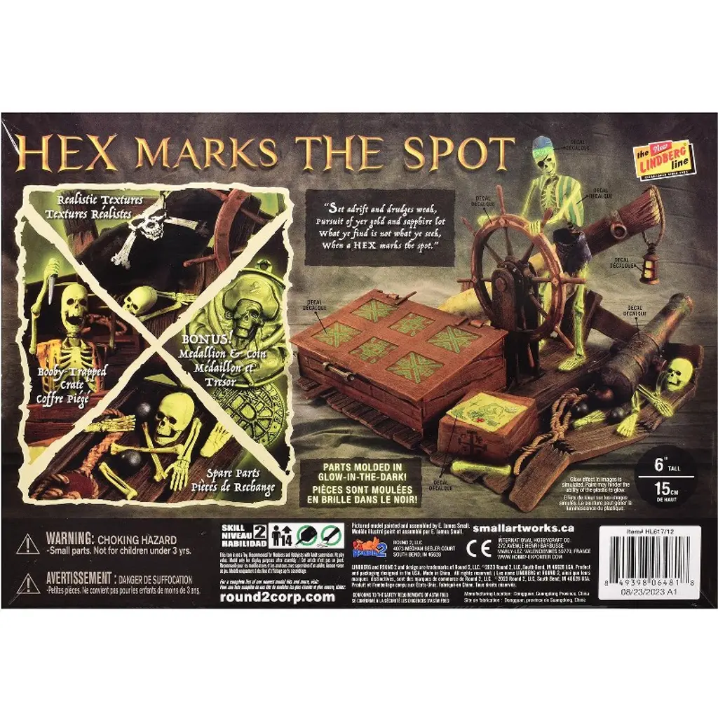 Brand new plastic model kit of Jolly Roger Series "Hex Marks the Spot" Diorama Set (Skill 2) 1/12 plastic model kit by Lindberg. Brand new box. Realistic textures. Rubber band action. Vintage style packaging. Officially licensed product. Contains 45+ detailed parts. Glows in the dark when left unpainted. Assembled model stands at 6 inches tall. Paint and cement required (not included). Manufacturer's original unopened packaging. Includes skeleton figure, spare parts, booby-trapped crate, and more. Parts molded in GLOW IN THE DARK PLASTIC, unless otherwise indicated.