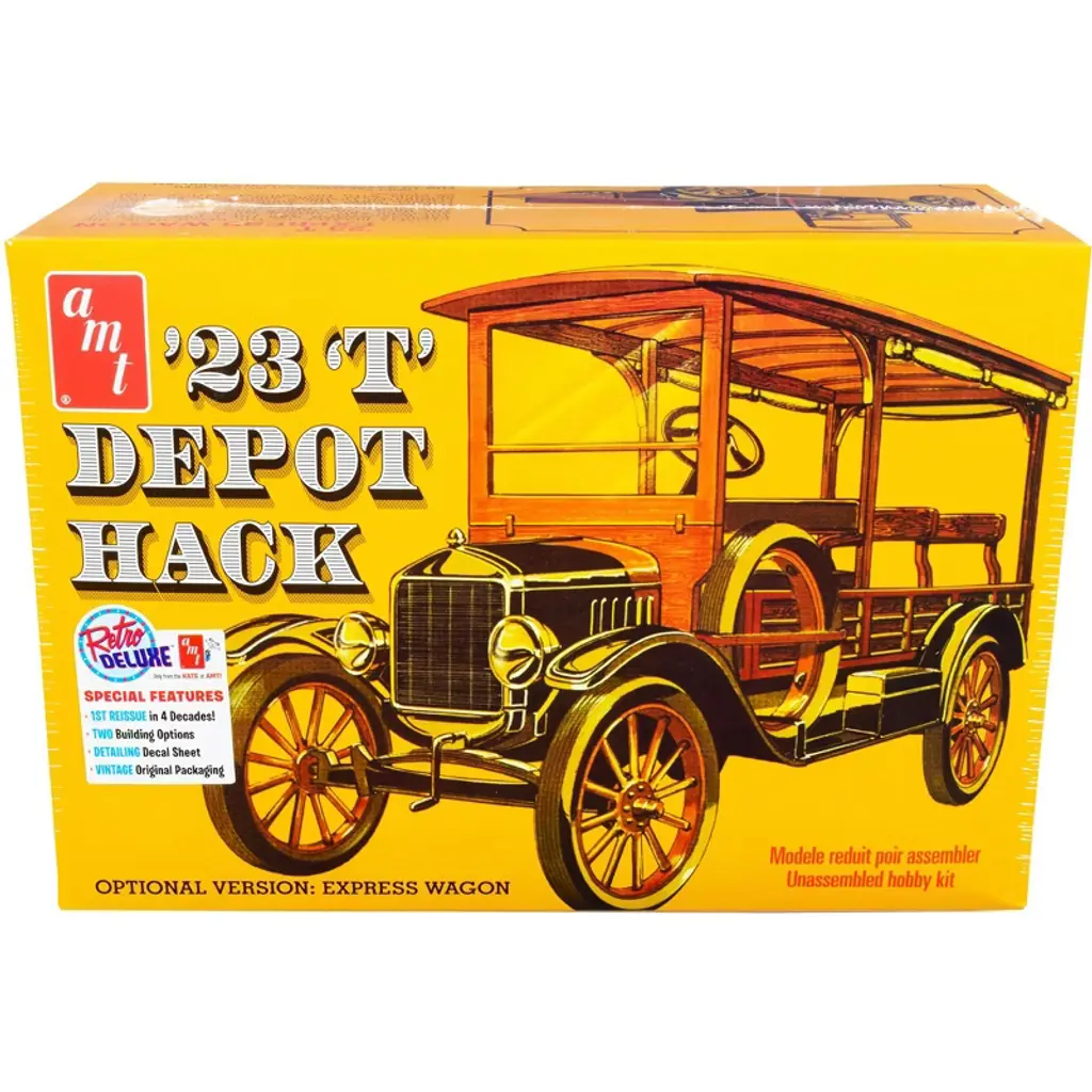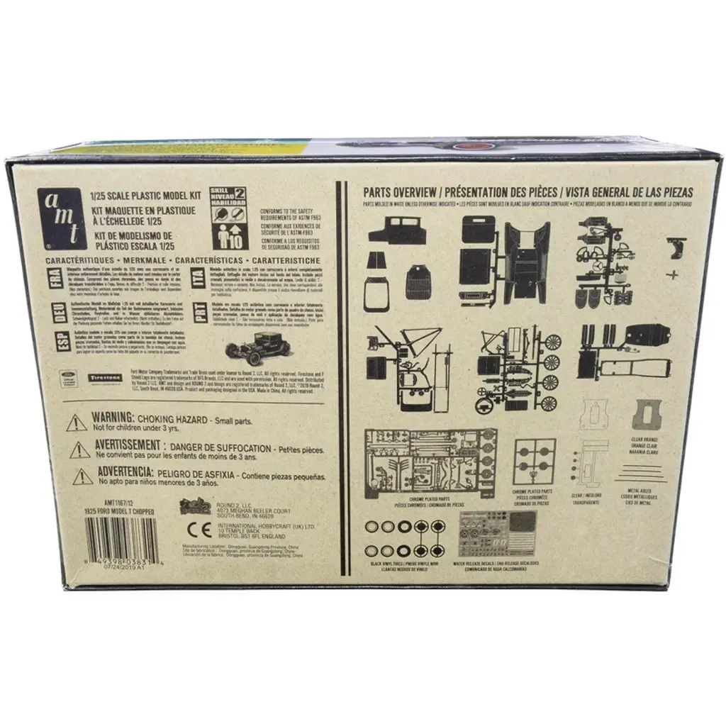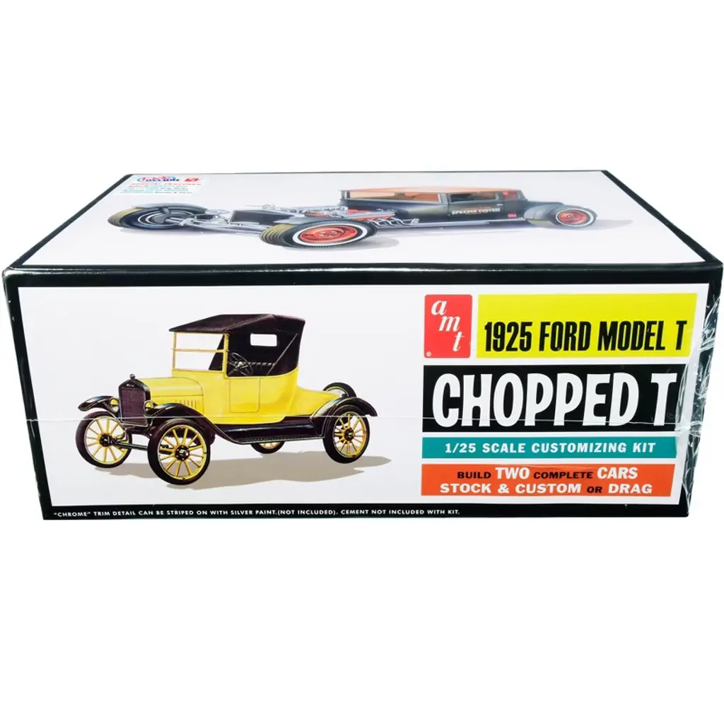 Brand new 1/25 scale plastic model kit of 1925 Ford Model T "Chopped" Set of 2 pieces (Skill 2) 1/25 plastic model kit by AMT. Brand new box. Open wheels. Salt flat discs. Chrome plated parts. Pre-lettered drag slicks. Optional tinted windows. Vintage style packaging. Customizing decals and parts. Black vinyl tires and metal axles. 2 complete engine - stock and Hi-Po V-8. Paint and cement required (not included). Parts molded in white, unless otherwise indicated. Build TWO complete cars: Stock, Custom or Drag. "Chrome" trim detail can be striped on with silver paint.
