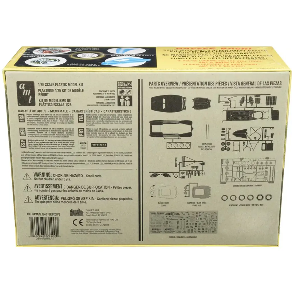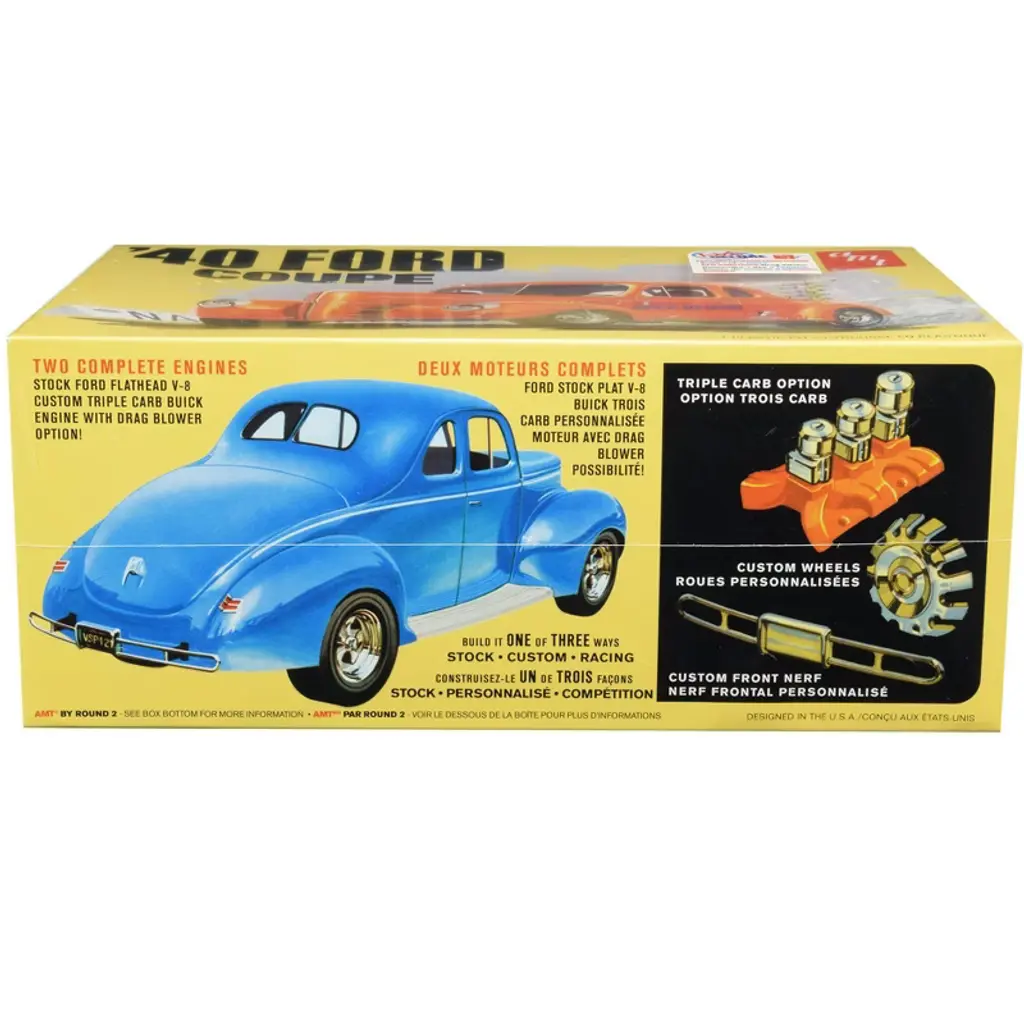 Brand new 1/25 scale plastic model kit of 1940 Ford Coupe 3 in 1 Kit (Skill 2) 1/25 plastic model kit by AMT. Brand new box. Grille filler. Mag wheels. Racing hood. Triple carb option. Vinyl racing slicks. Chrome plated parts. Red pinstripe drag slicks. 401 cubic inch Buick engine. Custom wheels and front nerf. Black vinyl tires and metal axles. Colorful drag racing decal sheet. Retro Deluxe™ vintage packaging. Paint and cement required (not included). Parts molded in white, unless otherwise indicated. Build your kit one of three ways: Stock, Custom or Racing. Two complete engines: Stock Ford Flathead V-8, Custom Triple Carb Buick engine with drag blower option.