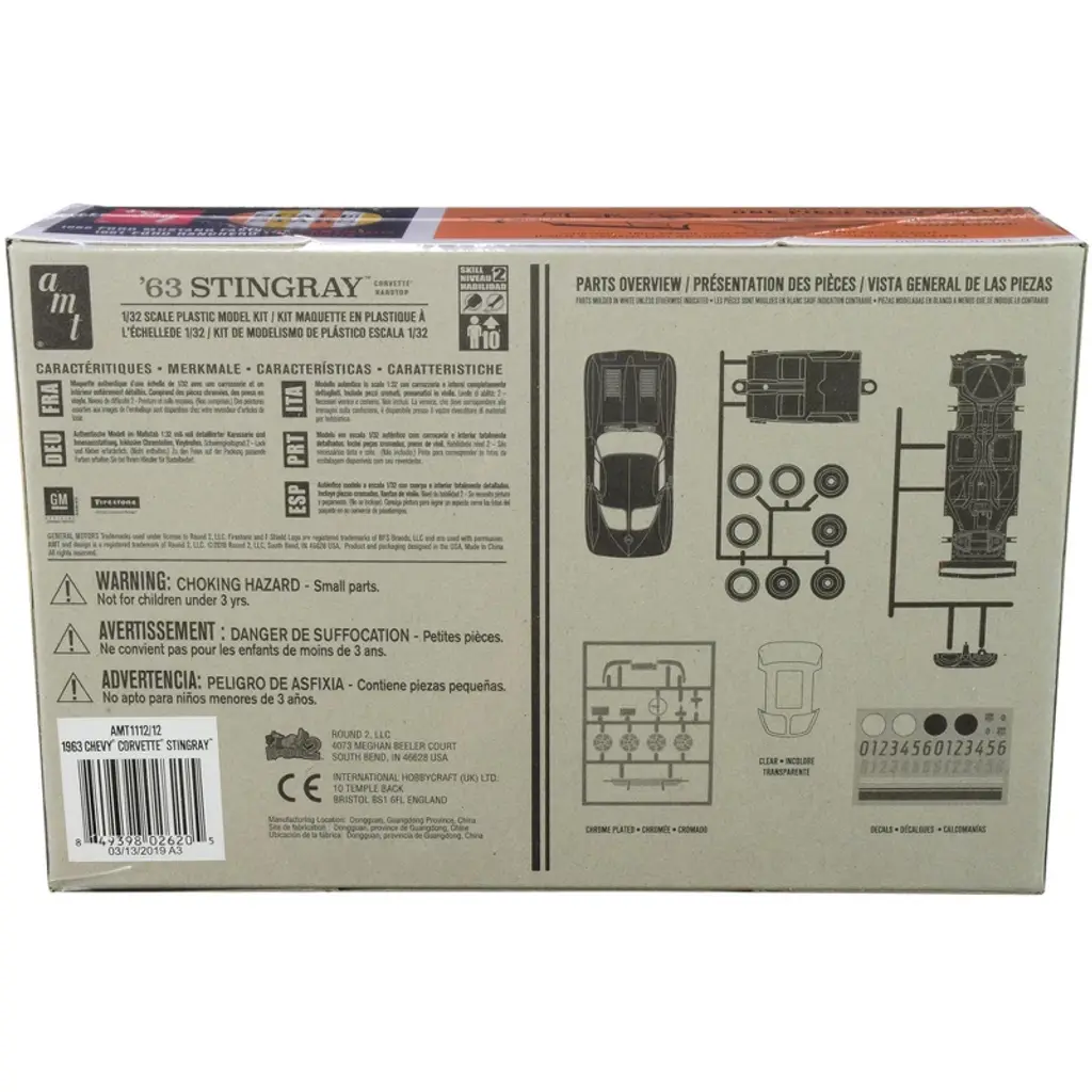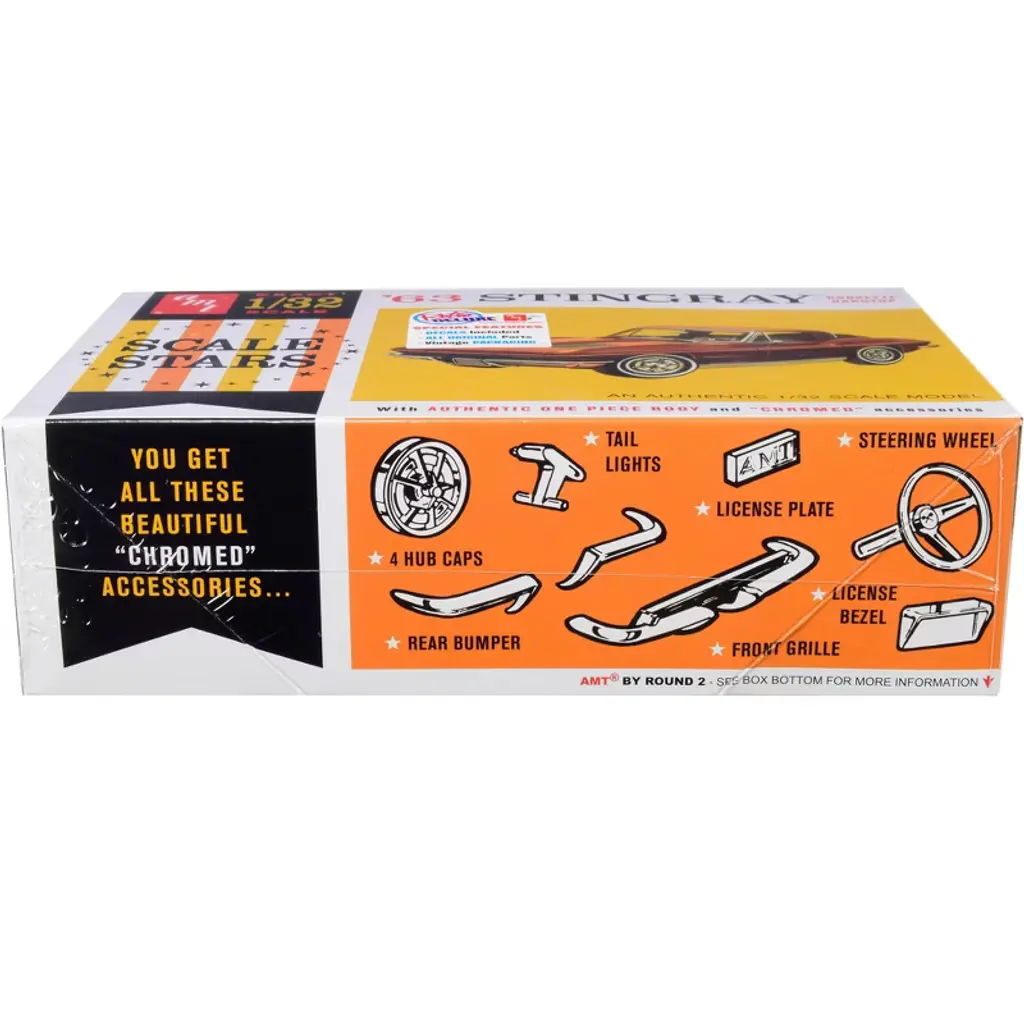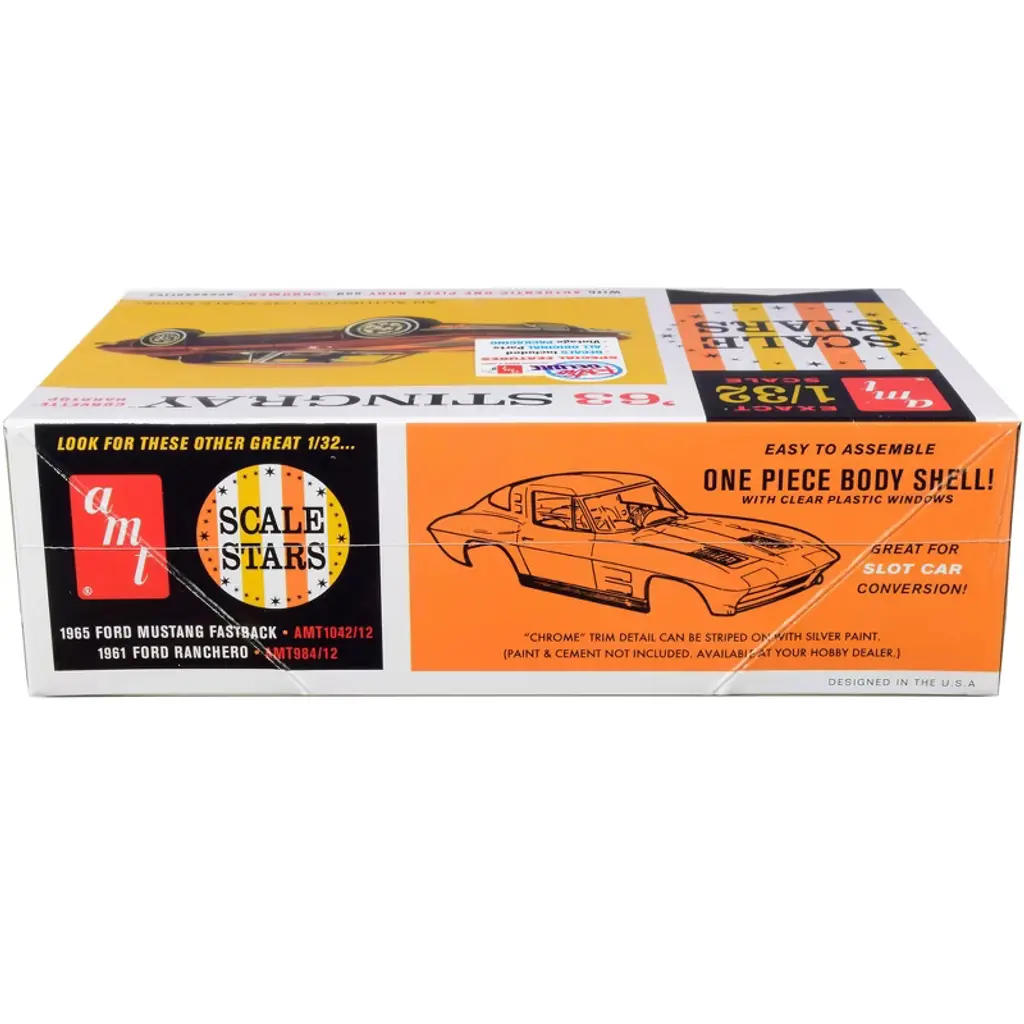 Brand new 1/32 scale plastic model kit of 1963 Chevrolet Corvette Stingray Hardtop "Scale Stars" (Skill 2) 1/32 plastic model kit by AMT. Brand new box. All original parts. Chrome plated parts. Vintage style packaging. Full color decals included. Great for slot car conversion. Authentic one piece body shell. Paint and cement required (not included). Parts molded in white, unless otherwise indicated. "Chrome" trim detail can be striped on with silver paint. "Chromed" accessories: rear bumper, taillights, front grille, 4 hubcaps, license plate, license bezel, steering wheel.