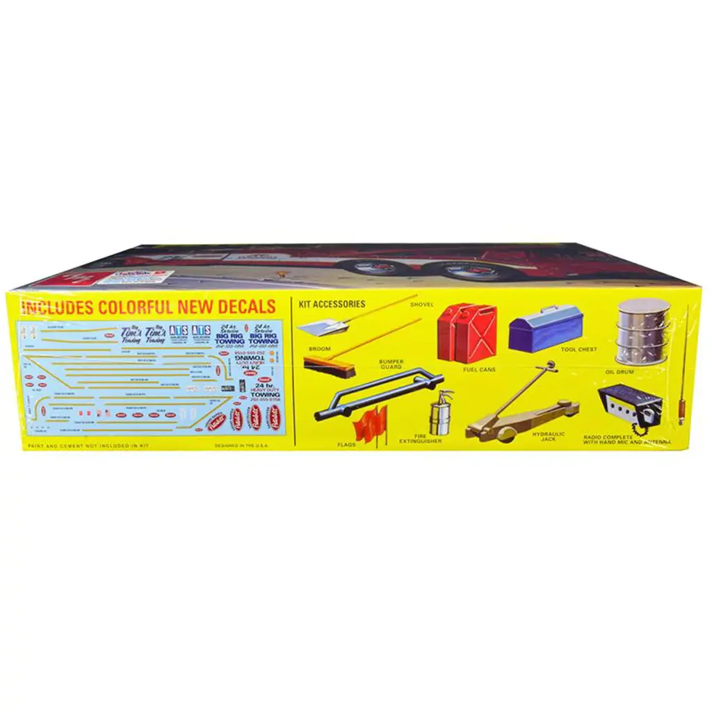 Brand new 1/25 scale plastic model kit of Peterbilt Wrecker Tow Truck (Skill 3) 1/25 plastic model kit by AMT. Brand new box. Ten black vinyl tires. Custom Wrecker body. Vintage style packaging. Colorful new decal sheet. Two piece telescoping boom. More than 250 highly detailed parts. Paint and cement required (not included). Parts molded in WHITE, unless otherwise indicated. Fully detailed cab, engine, drive train, interior and chassis. KIT ACCESSORIES INCLUDE FOLLOWING: Flags. Shovel. Broom. Oil drum. Fuel cans. Tool chest. Hydraulic jack. Bumper guard. Fire extinguisher. Radio complete with hand mic and antenna.
