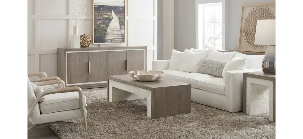 Designed to create a comfortable and inviting retreat within the home, the Skipper Rectangle Cocktail Table is defined by its casual finishes and variety of organic textures and materials that combine to deliver a relaxed aesthetic. Inspired by casual, waterfront living, the collection was designed to bring the relaxed aura of the outside in. White oak veneer delivers two key finishes, a whitewashed look and a weathered gray and is accented with sand blasted pine and soft white bronze metal details.