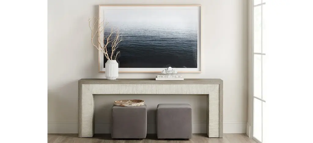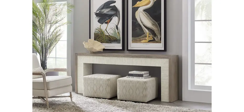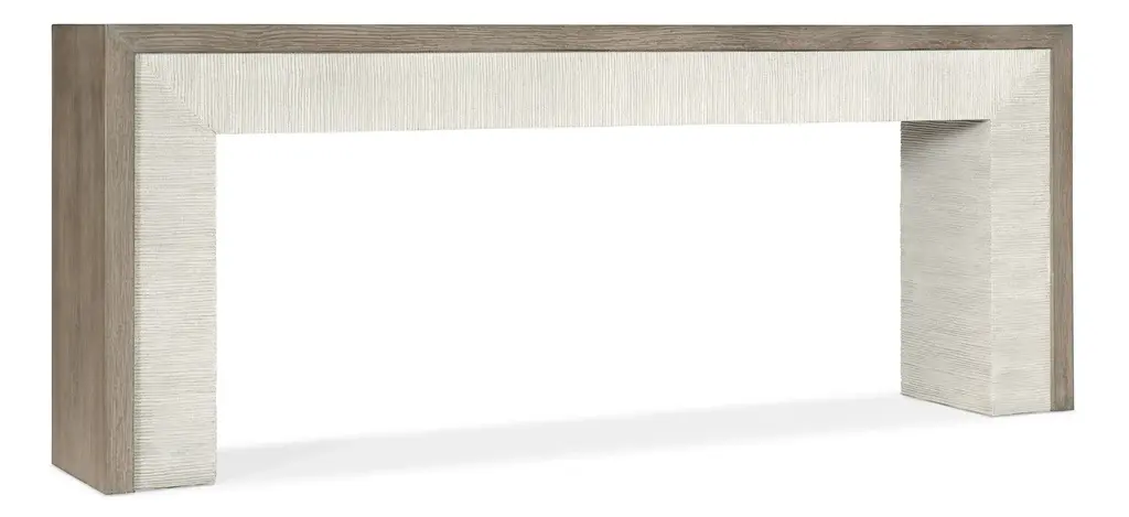 Designed to create a comfortable and inviting retreat within the home, the Skipper Rectangle Console Table is defined by its casual finishes and variety of organic textures and materials that combine to deliver a relaxed aesthetic. Inspired by casual, waterfront living, the collection was designed to bring the relaxed aura of the outside in. White oak veneer delivers two key finishes, a whitewashed look and a weathered gray and is accented with sand blasted pine.