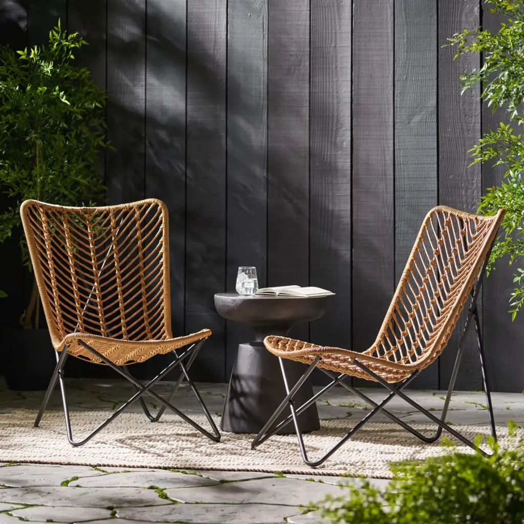 Skran Set Of 2 Outdoor Lounge Chairs, Boho Style Seating With Wicker And Iron Frame, Patio Garden Accent Chairs Set With Curved Back, Light Brown