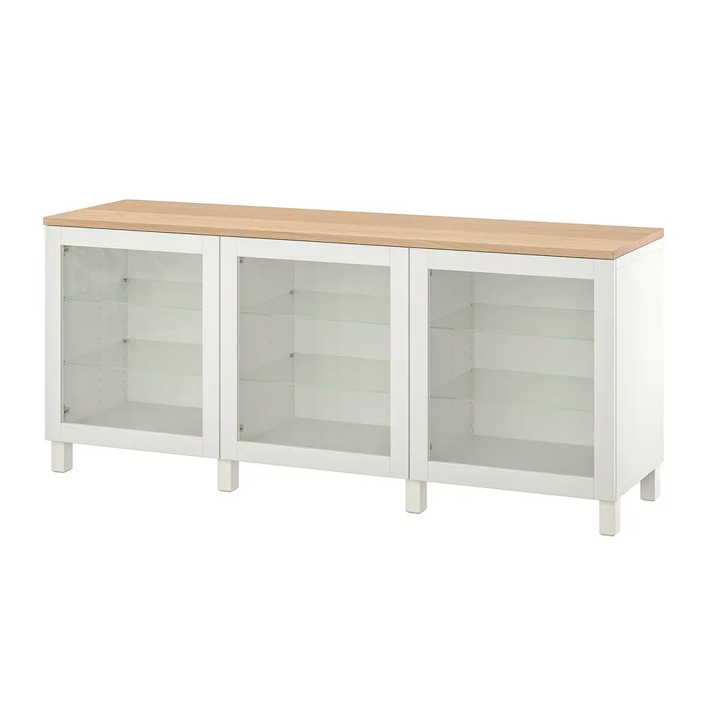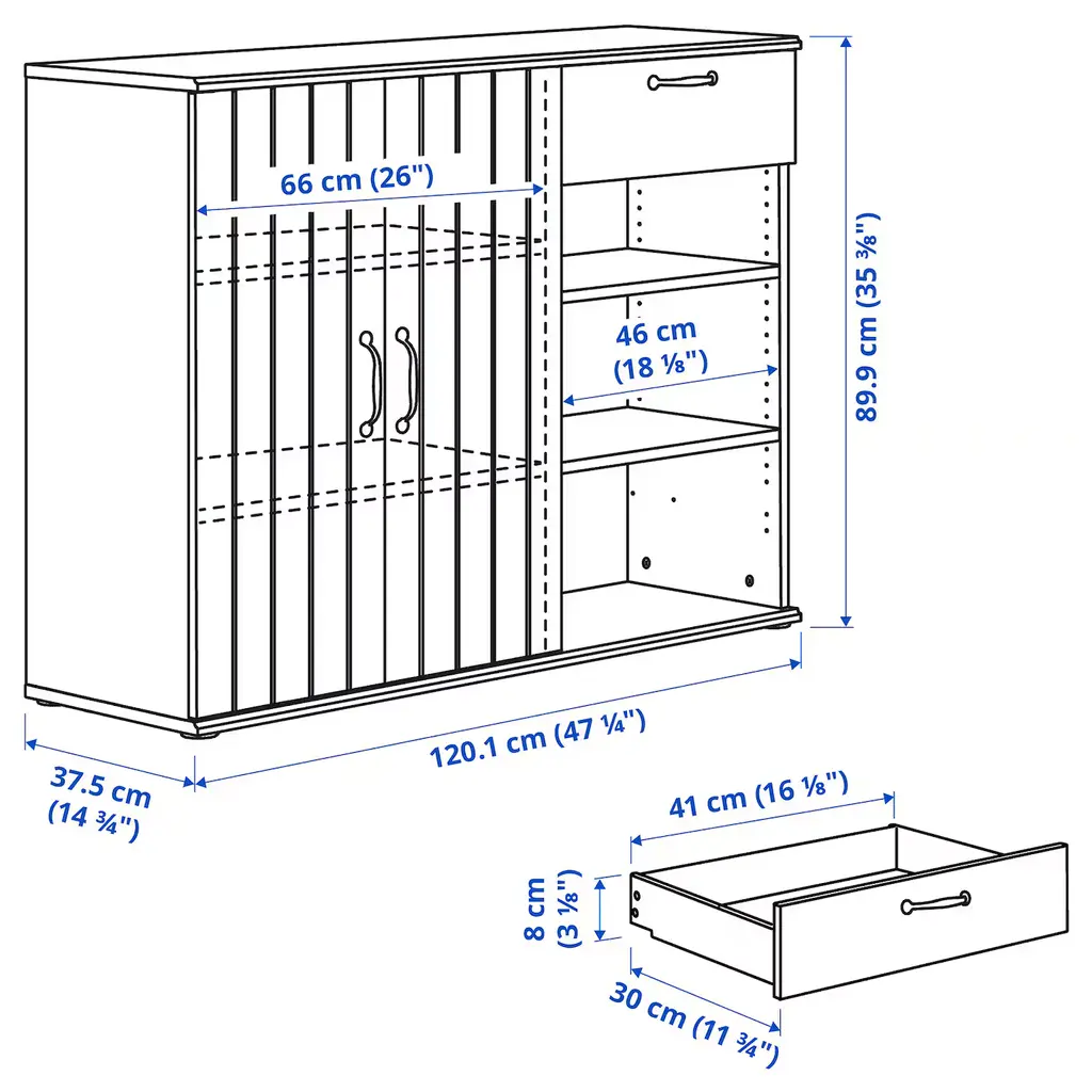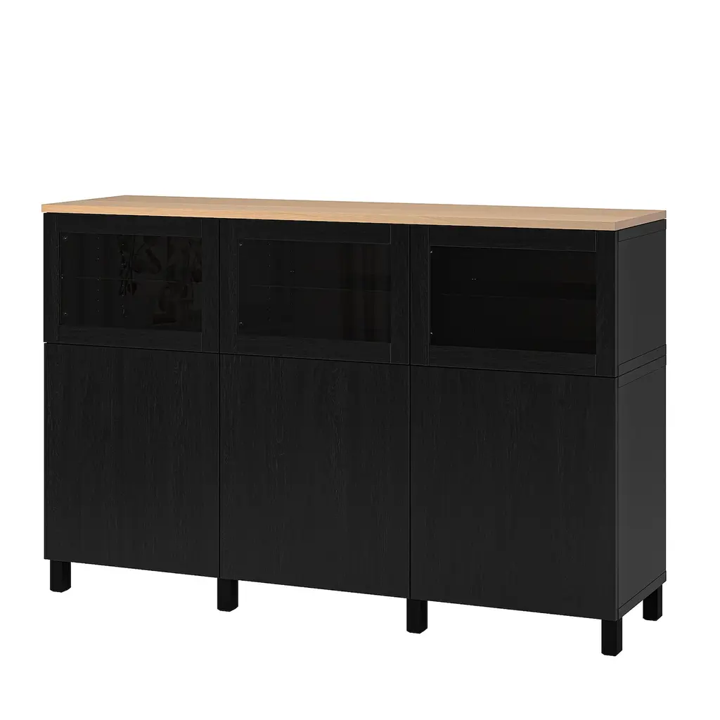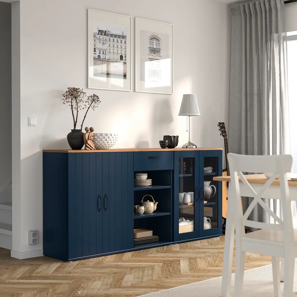 SKRUVBY Storage combination w/glass doors - black-blue 74 3/4x35 3/8 ". Place your favorite objects on display on top of the sideboard and hide items that tend to clutter in the drawer or behind the door. The oak look of the top panel creates a warm and natural look.