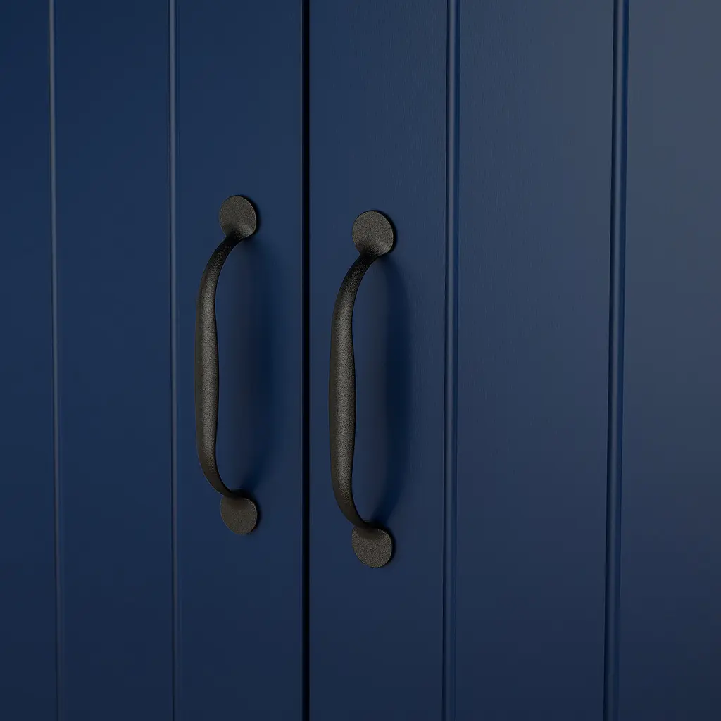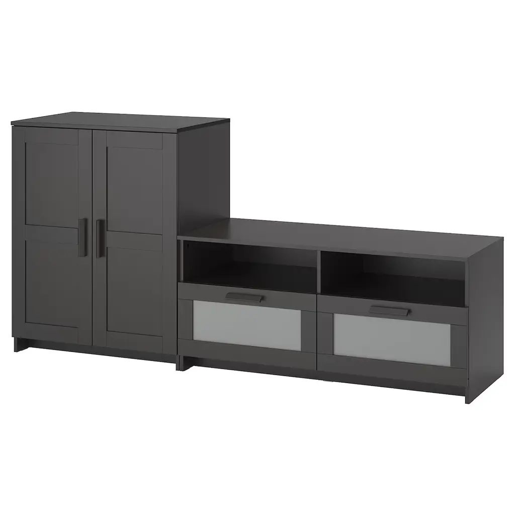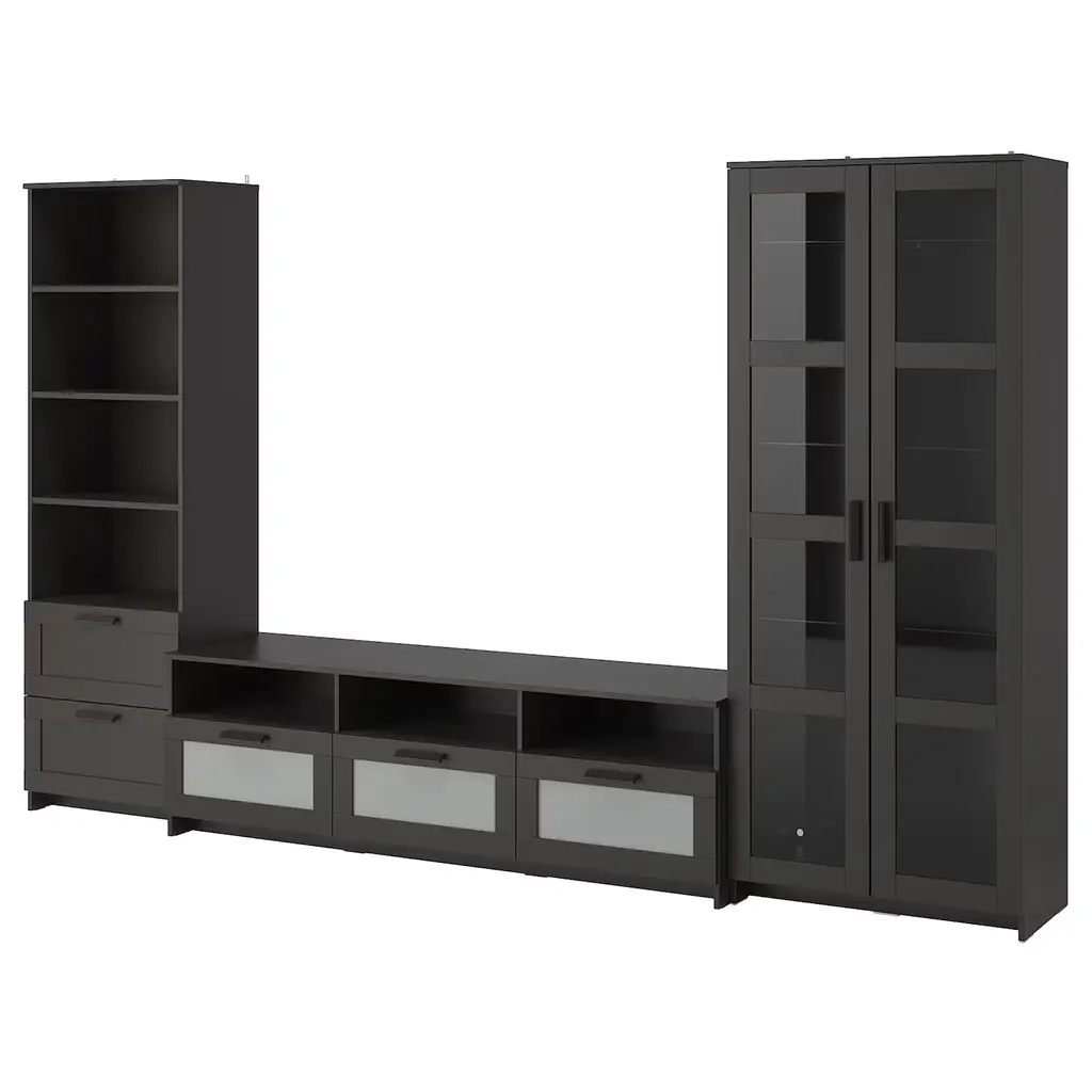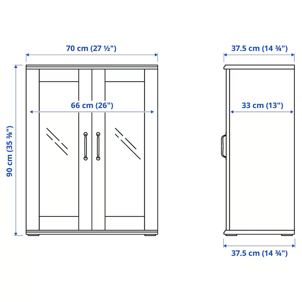 SKRUVBY Storage combination w/glass doors - black-blue 74 3/4x35 3/8 ". Place your favorite objects on display on top of the sideboard and hide items that tend to clutter in the drawer or behind the door. The oak look of the top panel creates a warm and natural look.