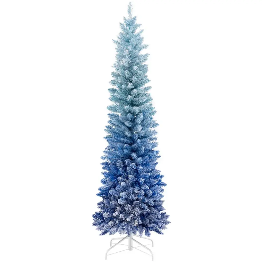 Sky Blue Fir slim artificial Christmas tree featuring PVC tips and blue Dura-Lit® LED Italian style lights on sky blue wire. A fun and festive alternative to the traditional green Christmas tree, this brilliant tree comes prelit with blue Dura-Lit® LED mini lights, has rich colored PVC tips on metal hinged branches, an on/off step switch, and a metal tree stand is included.