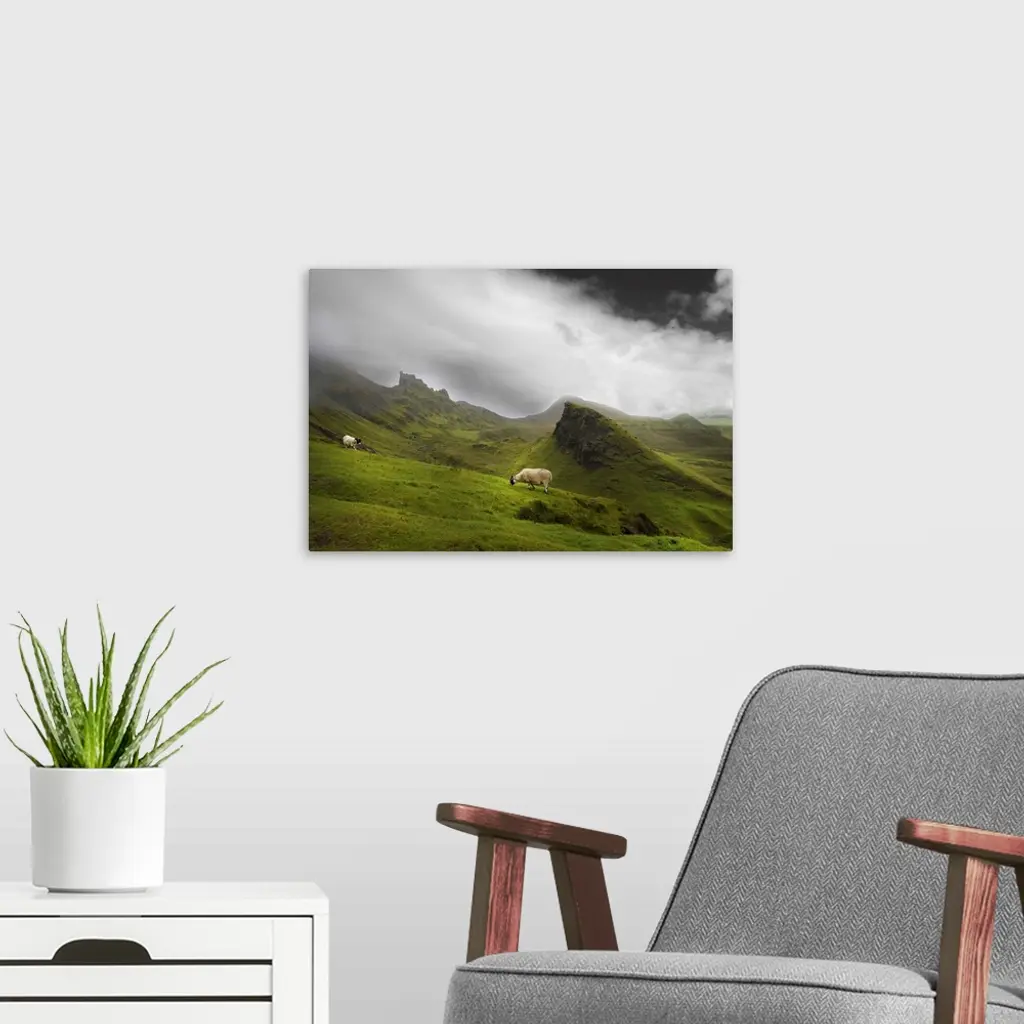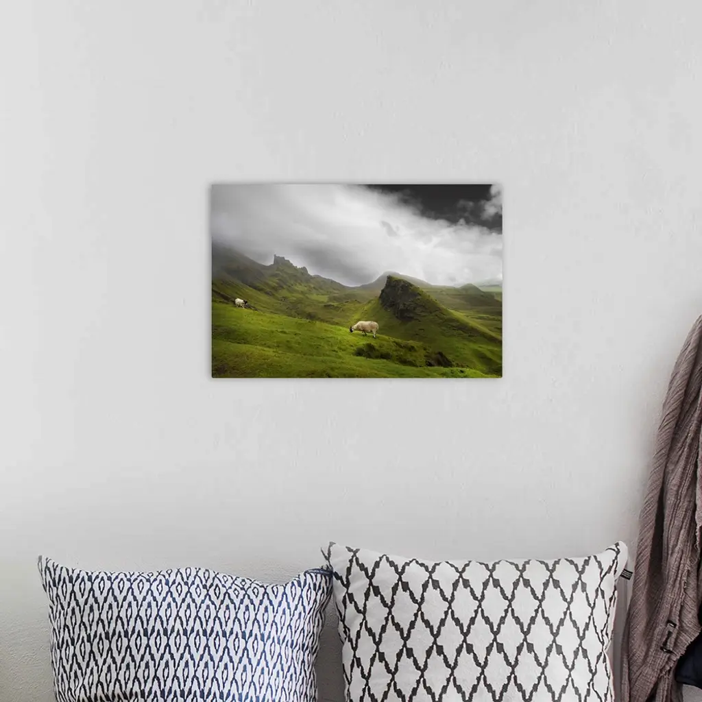 Fine art photo of a misty valley full of large rocky outcroppings with two grazing sheep.