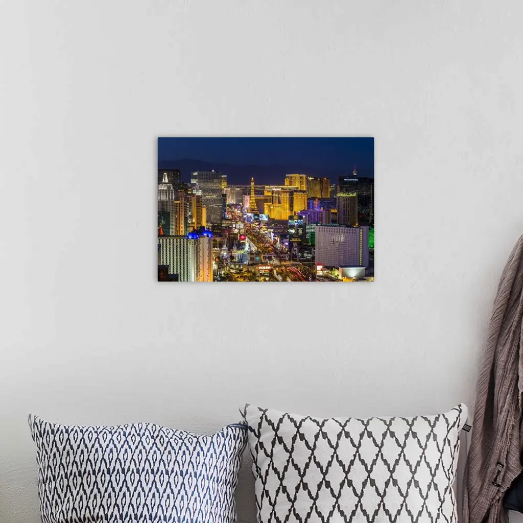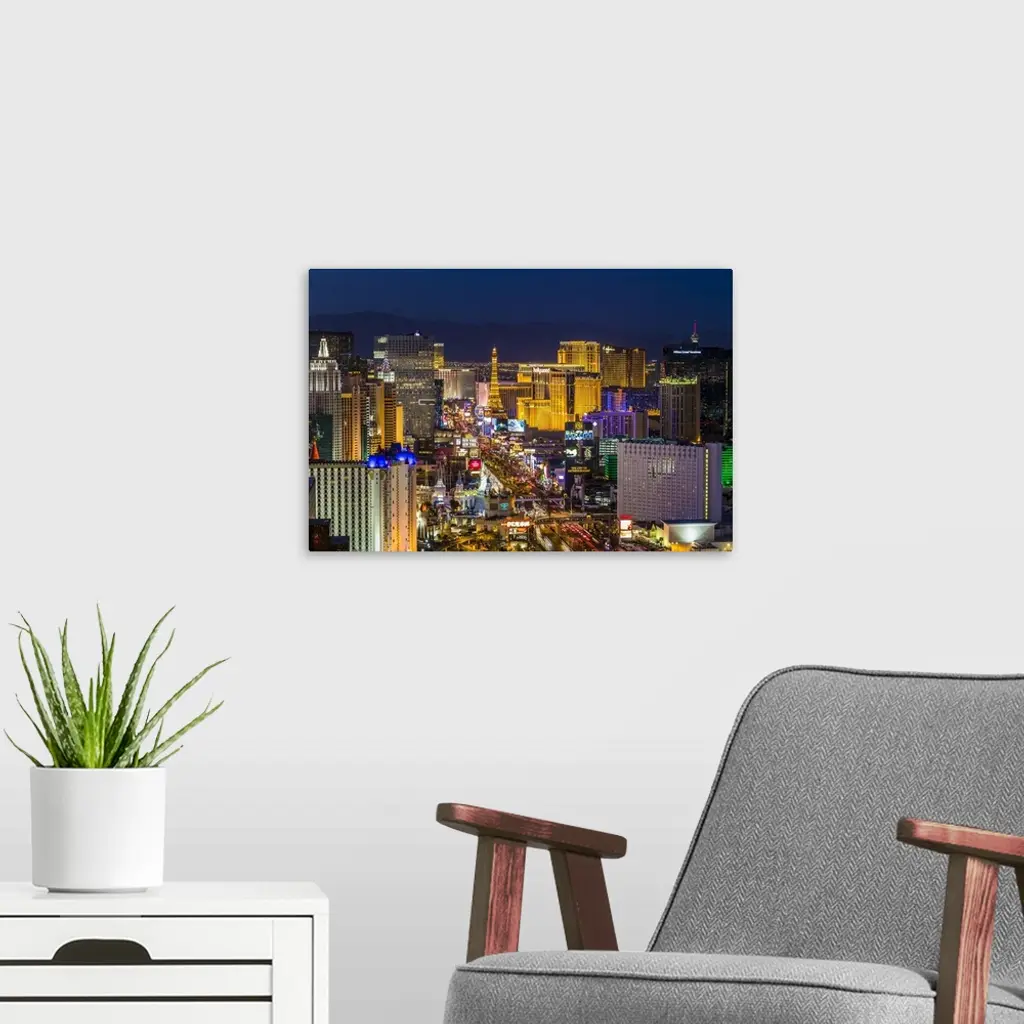 Las Vegas skyline, showing Las Vegas Strip at twilight, Las Vegas, Nevada, USA. Most of the largest attractions and hotels are located on the Strip.