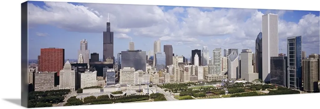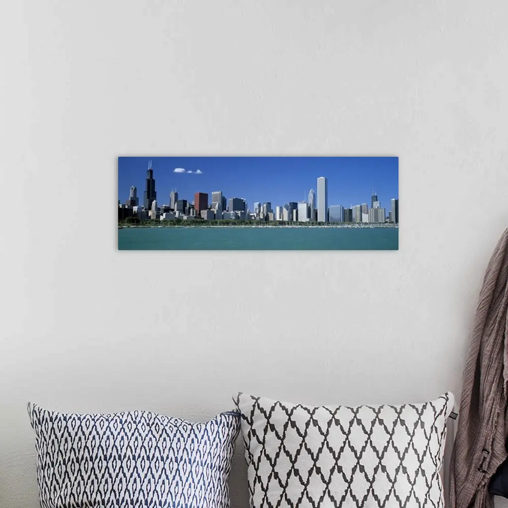 Panoramic photograph shows a row of skyscrapers in the Midwestern United States overlooking the calm waters of a river on a near cloudless day.