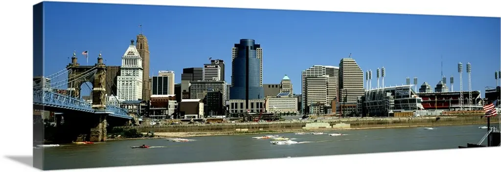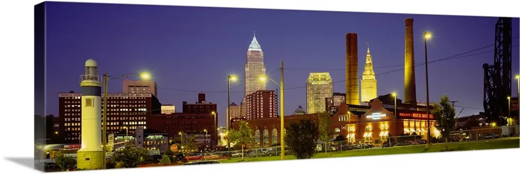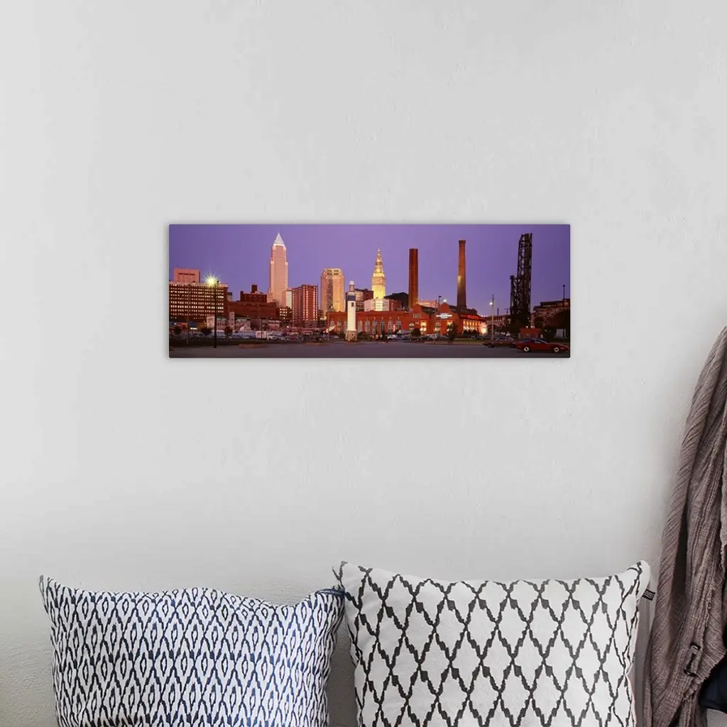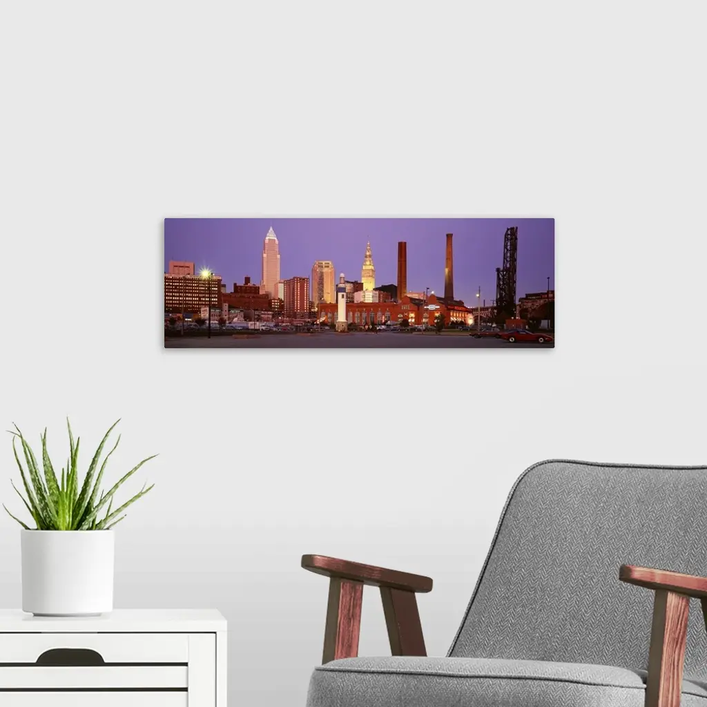 Panoramic photograph of skyscrapers in Cleveland, Ohio, lit up at night.