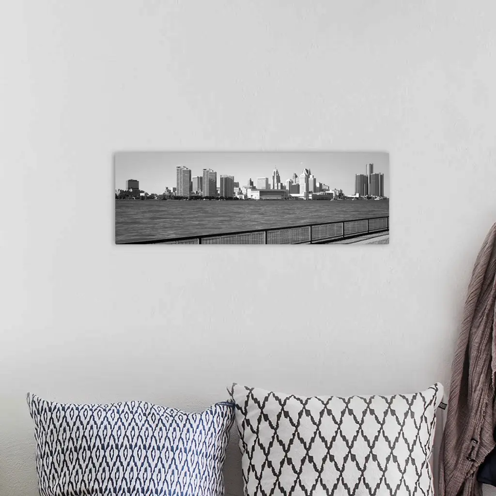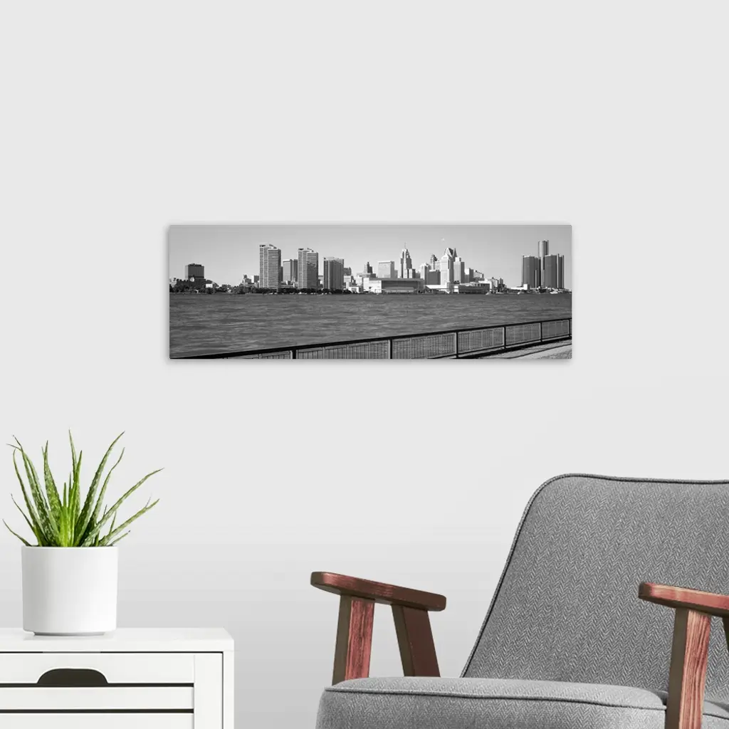 This panoramic photograph is in black and white and taken of the Detroit skyline from across the river that is in front of it.