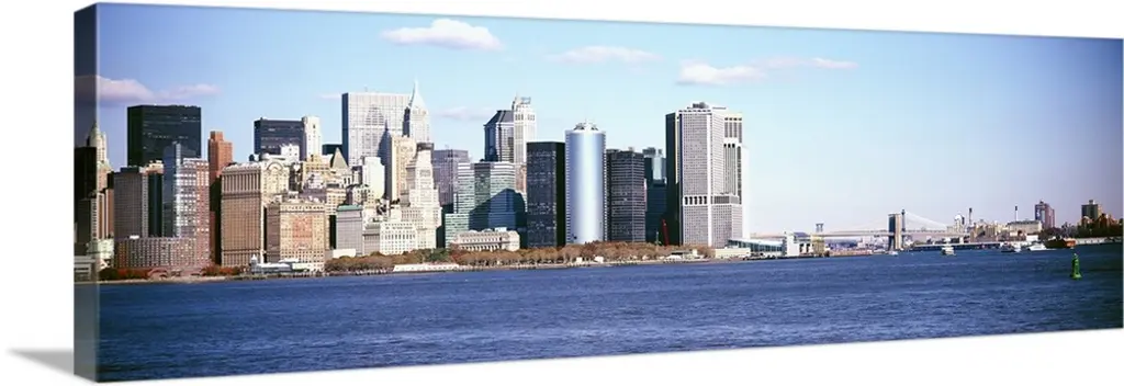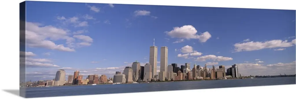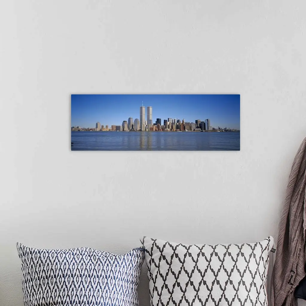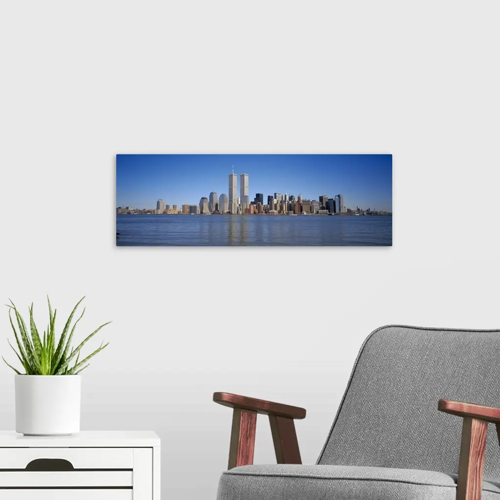 Panoramic, distant photograph of the New York City skyline including the World Trade Center, reflecting in the water in the foreground.