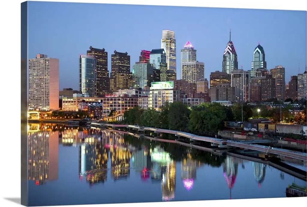 Street view photograph of tall buildings lit up in a city at dusk.