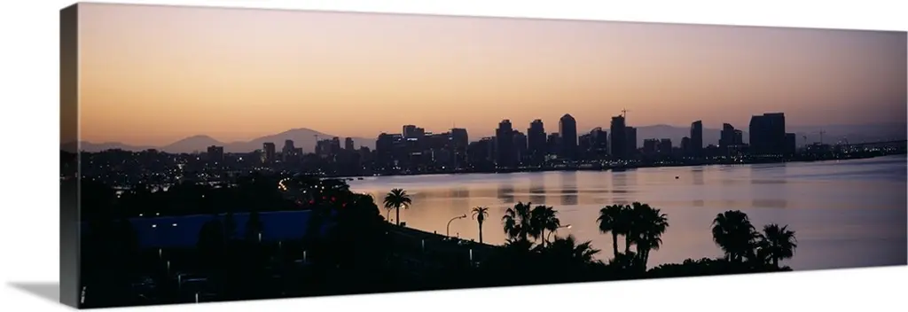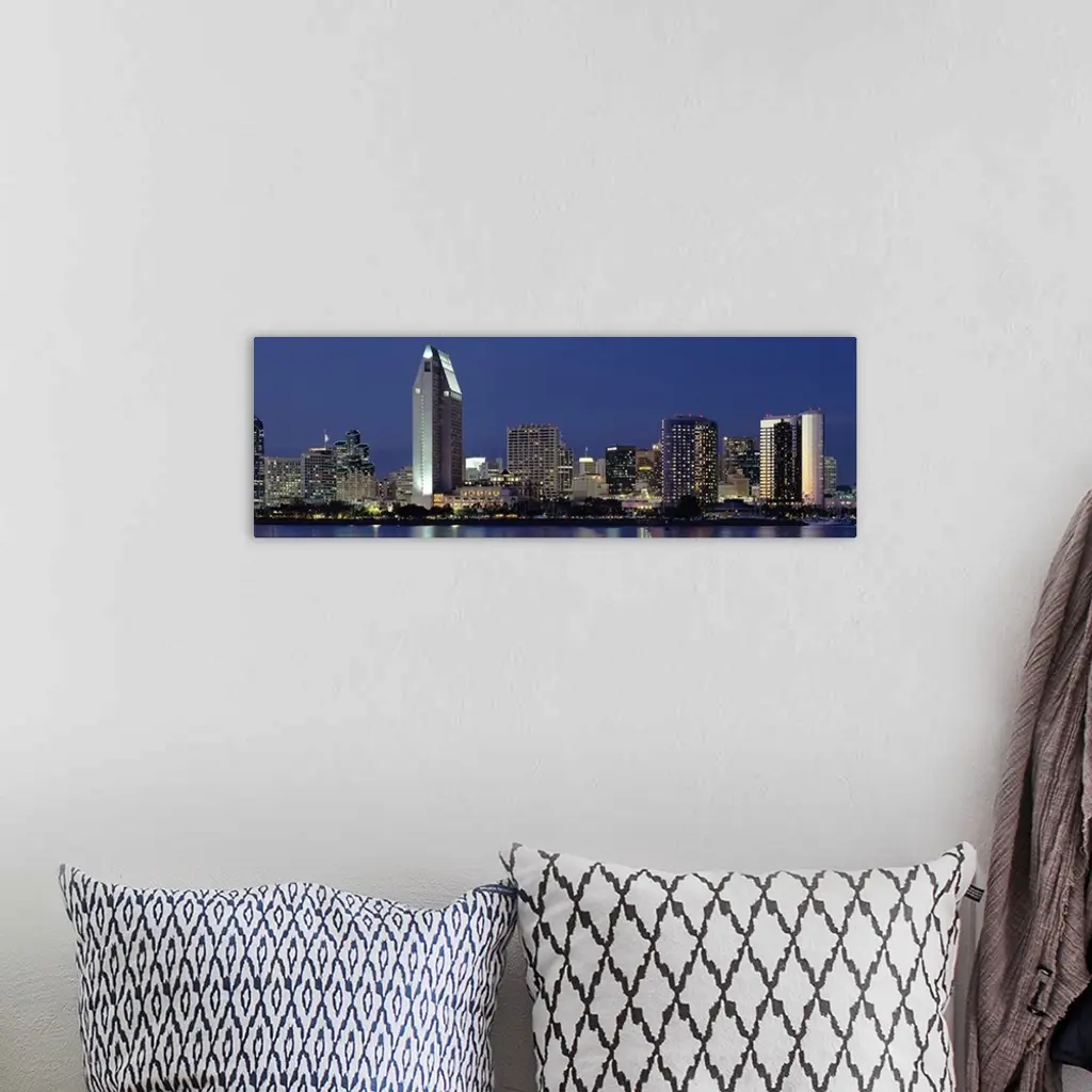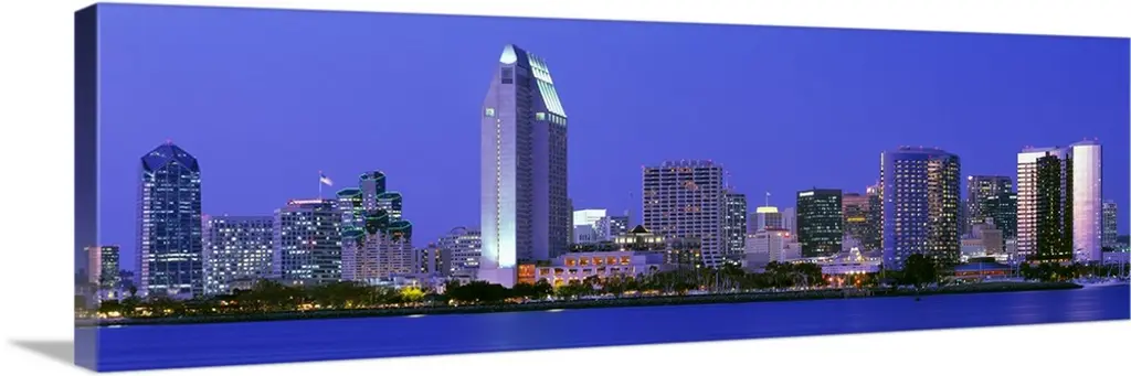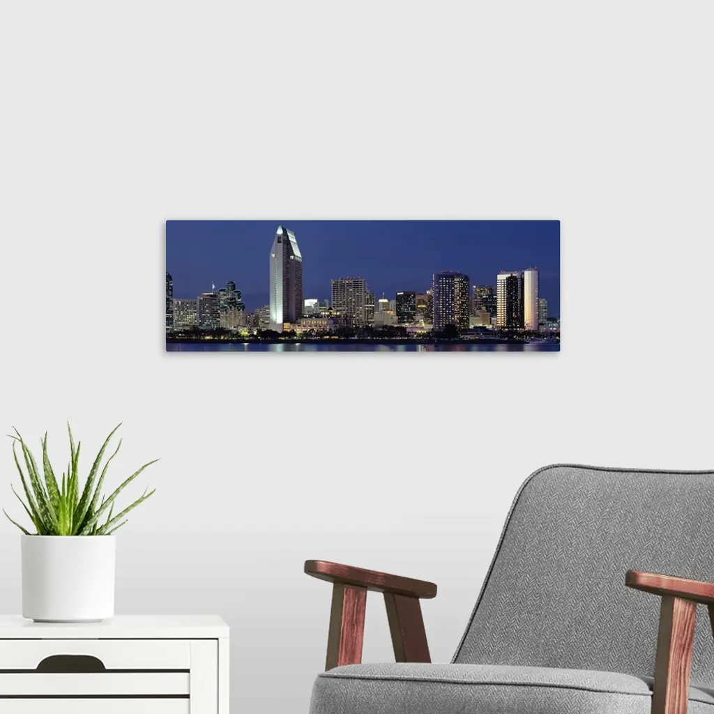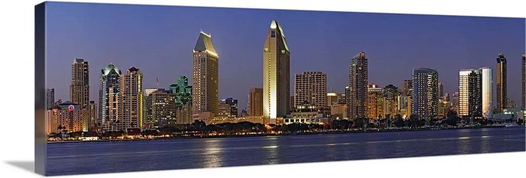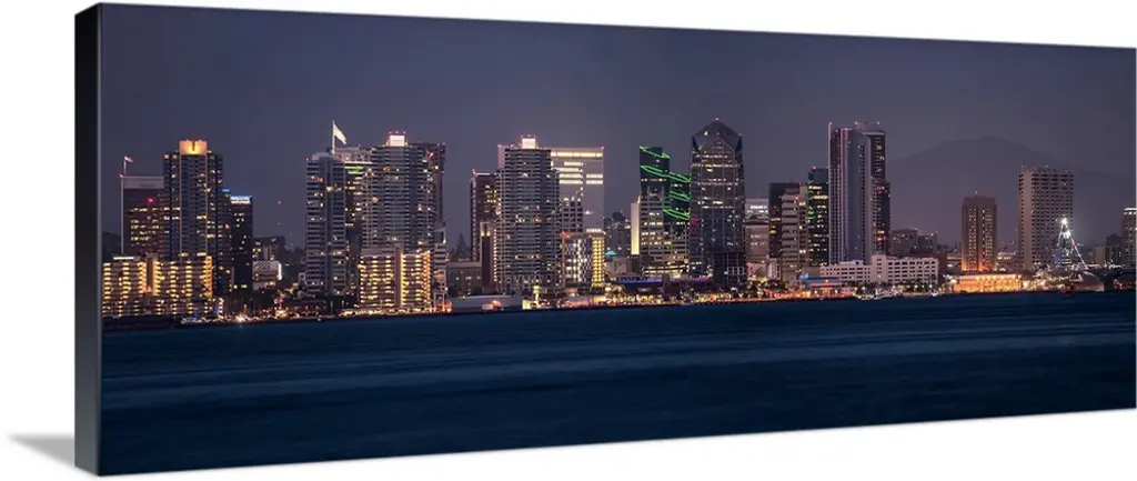 This large panoramic photograph is of the San Diego skyline at night with all of the buildings lit up under a dark blue sky. A body of water is shown in front of the buildings.