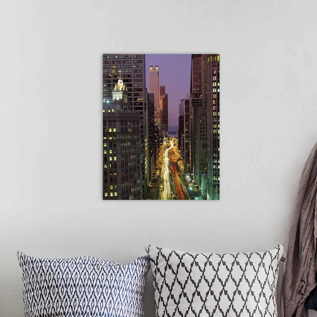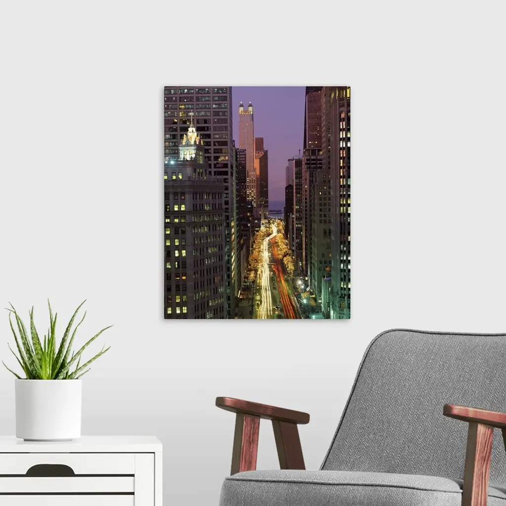 A vertical picture taken in between skyscrapers that line a street in Chicago with cars lights streaking by on the road.