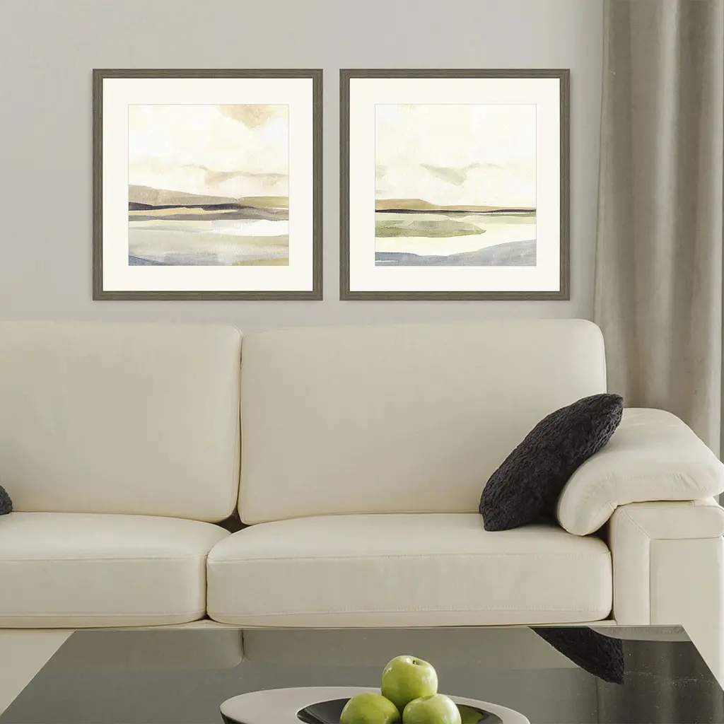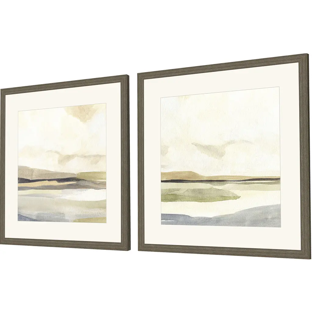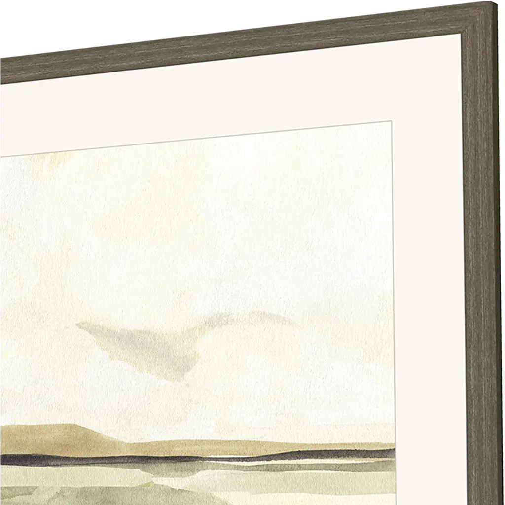 Abstract horizons are matted in white. Framed in a medium wood-grain finish moulding.