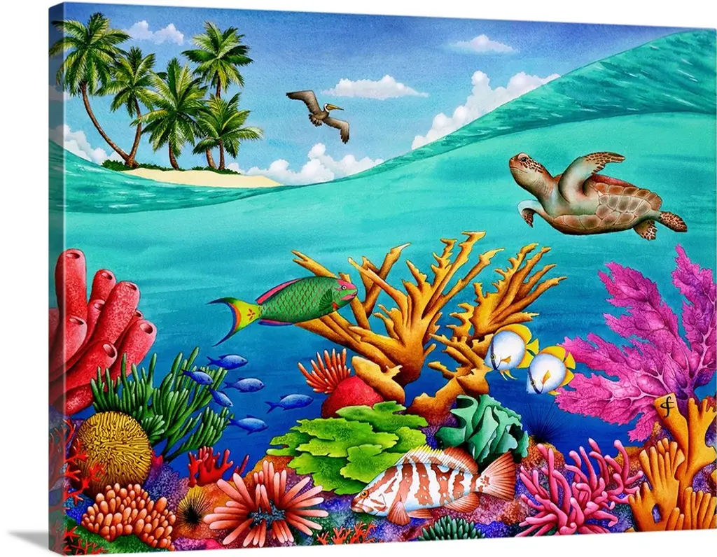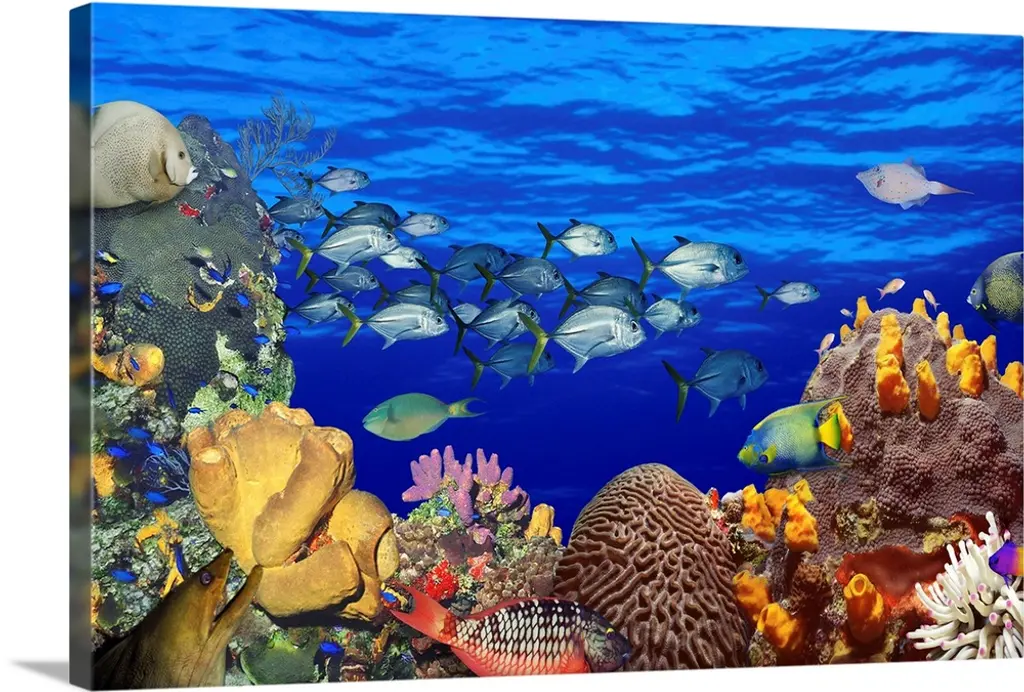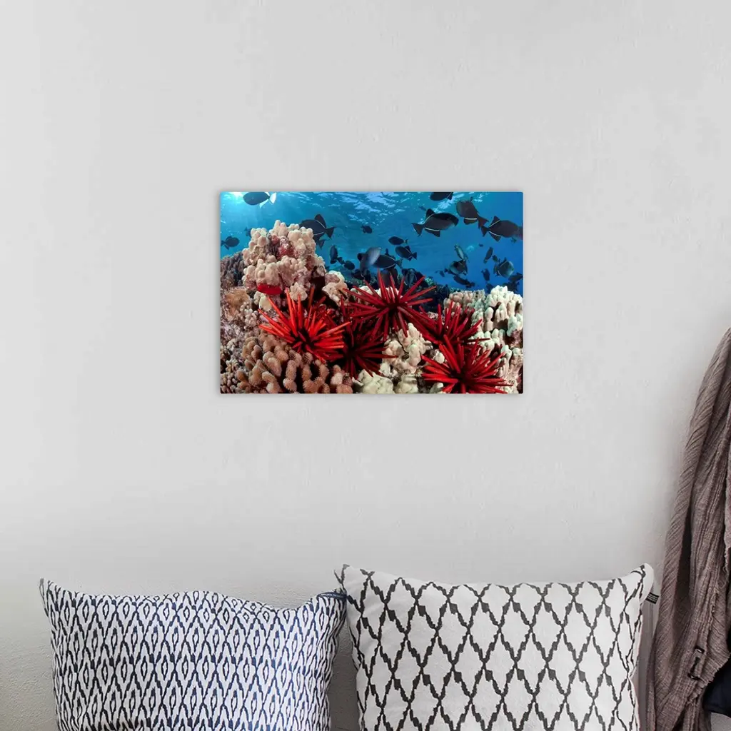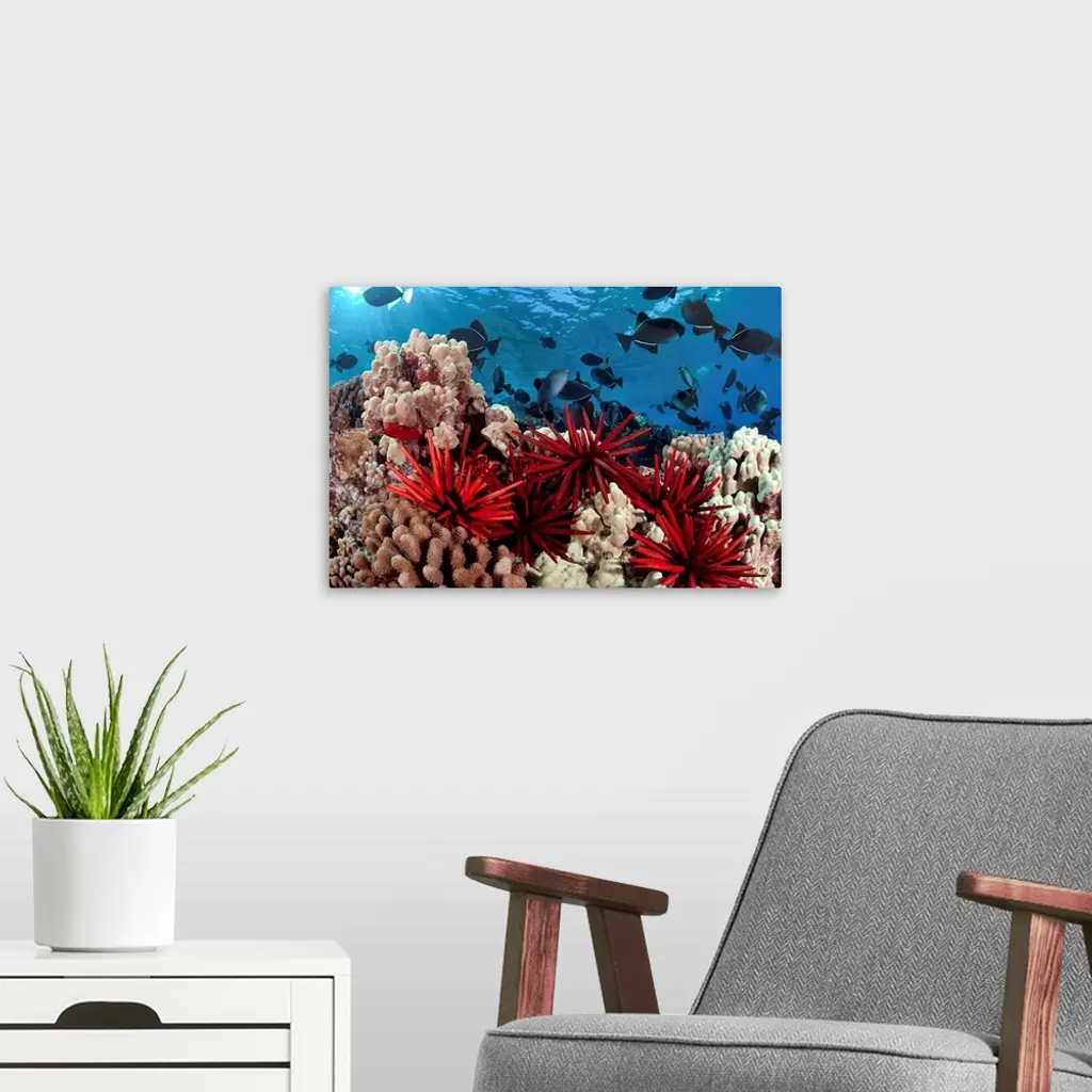 Slate Pencil Sea Urchins Color With Black Triggerfish And Hard Coral wall art for home and office decor. Discover canvas art prints, photos, mural, big canvas art and framed wall art in GreatBigCanvas.com's varied collections.