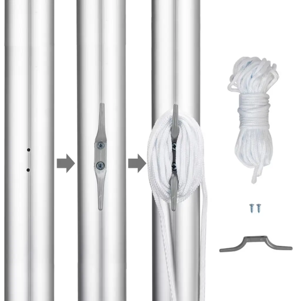 Show your patriotic pride with the US Flagpole Kit. This sectional halyard pole is designed for easy setup and convenient storage, making it ideal for homes, offices, or community displays. The 16-gauge aluminum construction is strong, lightweight, and rust-resistant, ensuring reliable performance for years to come. The kit includes a gold ball finial, rope, sleeves, carabiners, and two 3x5 ft American flags. The sectional design allows you to extend the pole to 20 or 25 feet, while the 10 cm shrinkage length provides extra stability. Raising and lowering the flags is simple with the included rope system, making it functional for daily use or special occasions. This flagpole kit makes it easy to display your national pride, combining practicality, strength, and a classic design that stands out in any outdoor setting.
