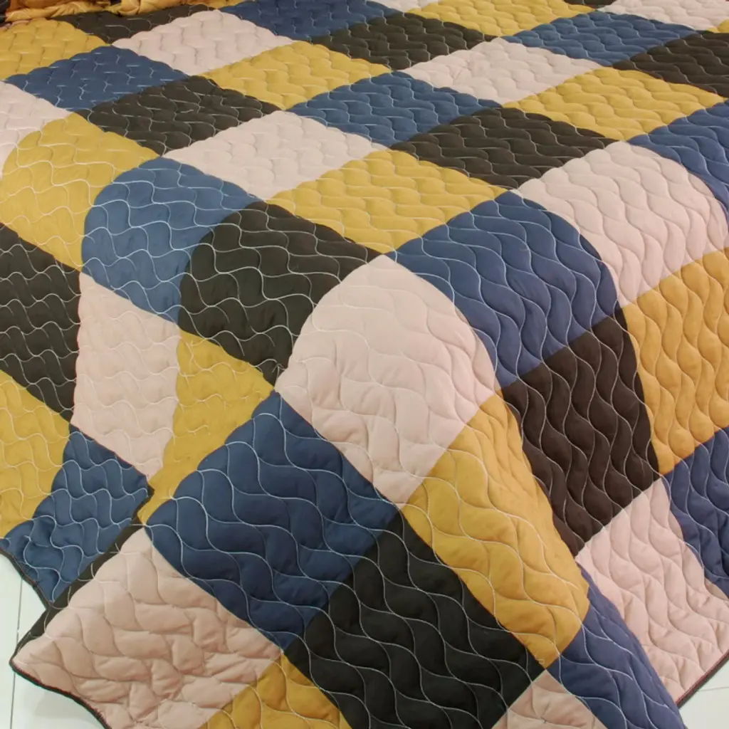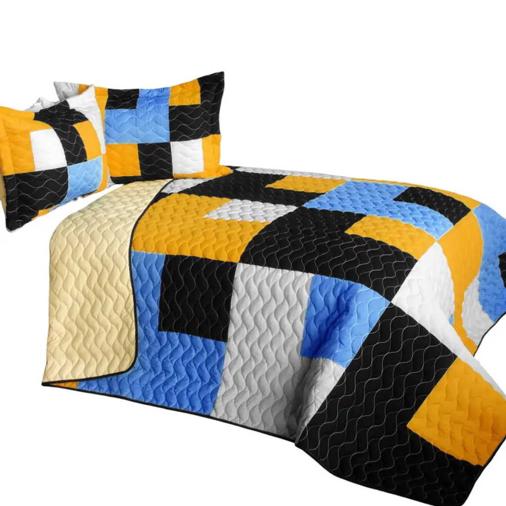 Elevate your bedroom with this 3-Piece Patchwork Quilt Set (Full/Queen Size), featuring a quilt and two matching quilted shams. Designed with vermicelli quilting, it offers a richly textured look and feel. Each quilt is handmade or machine-stitched, giving it unique character with slightly curved quilting details. Choose from a variety of color options like Yellow, Green, Brown, Purple, Dark Blue, or Light Blue—each with a charming patchwork design that adds warmth and style to any space. This quilt set is reversible, pre-washed, and pre-shrunk for a soft feel and easy fit. All pieces are machine washable on a gentle cycle and can be tumble dried on low heat, making them simple to maintain. With dimensions of 90.5” x 90.5” for the quilt and 24” x 33.8” for each sham, this set is ideal for Full/Queen beds and brings an instant update to your bedroom or guest room.