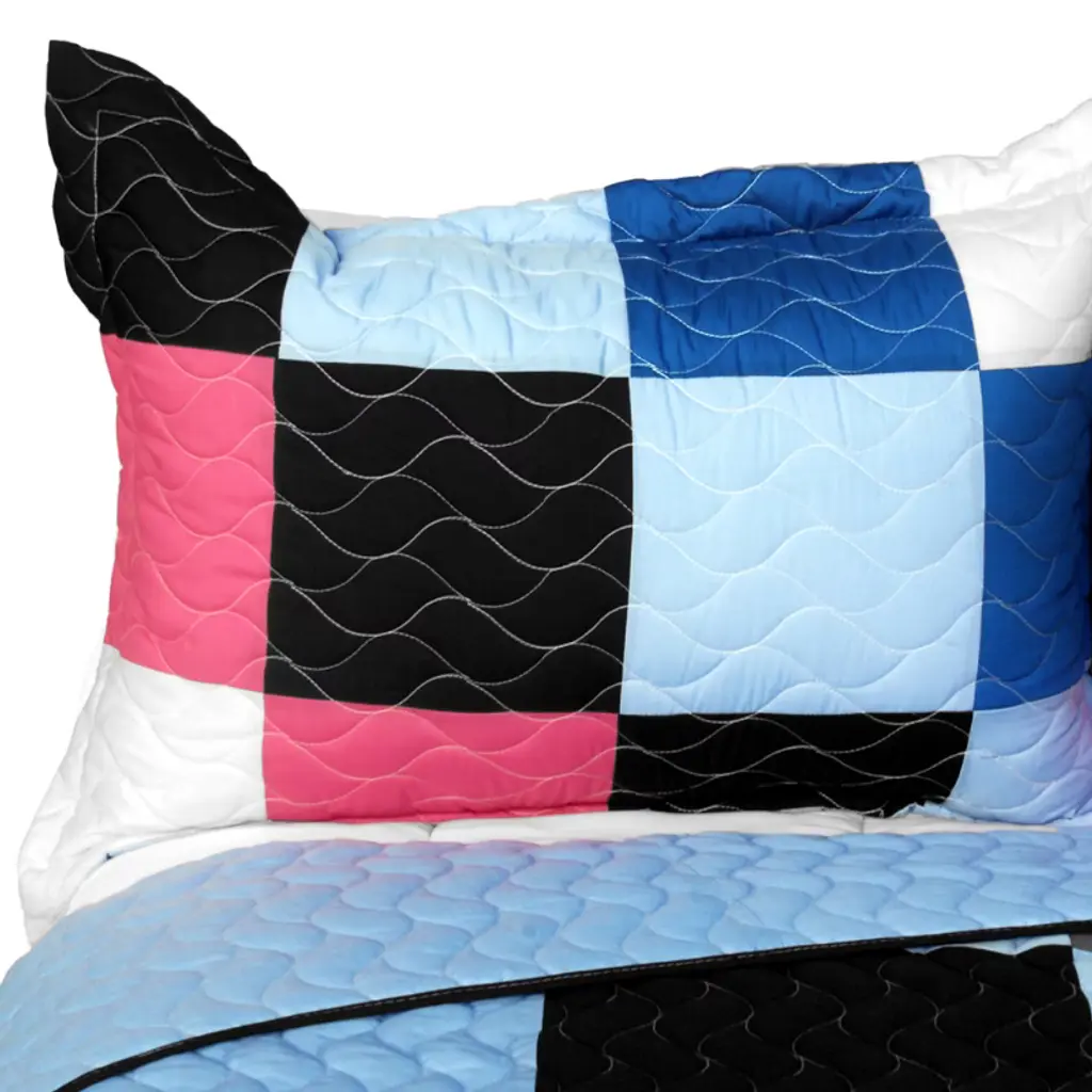 Slickblue Full/queen 3Pc Quilt Set, Checkered Design, Hand-stitched, 100% Tc, Patchwork, Blue