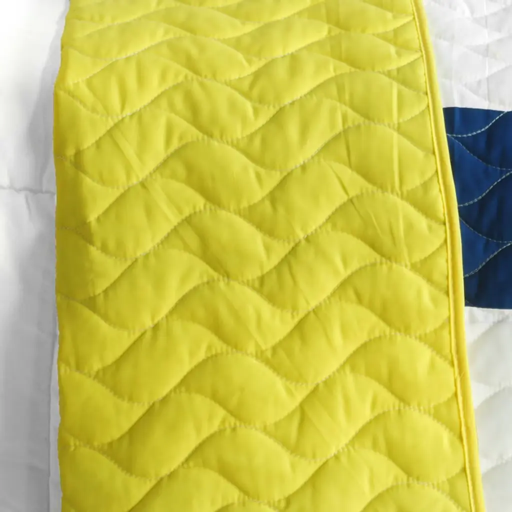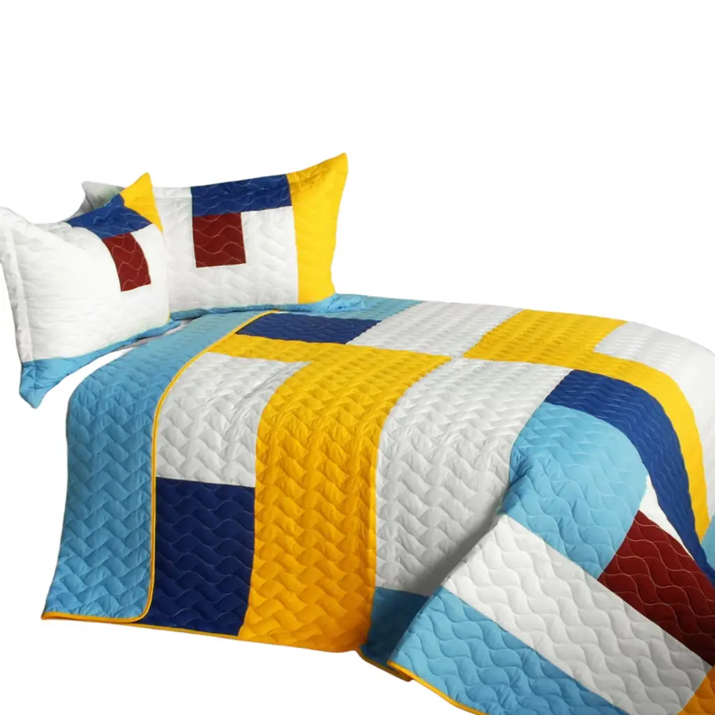 Refresh your bedroom decor with the TC Fabric Patchwork Geometric Design Quilt Set (Full/Queen Size). This set includes a quilt and two quilted shams, all crafted with care and finished with detailed vermicelli stitching for a soft, textured look. The handmade nature of this set means each piece has its own unique charm, and slight curved stitching adds character. Choose between two eye-catching color options — Yellow or Blue — to match your personal style. This quilt set is designed for easy, everyday use. Simply machine wash on cold with a gentle cycle and tumble dry on low heat. The pre-washed and pre-shrunk fabric helps maintain its shape wash after wash. Thanks to its reversible design, you can switch between two looks with a simple flip, making it perfect for quick room refreshes. Whether you're decorating a guest room or your own, this quilt set brings a cozy and welcoming touch to any space.