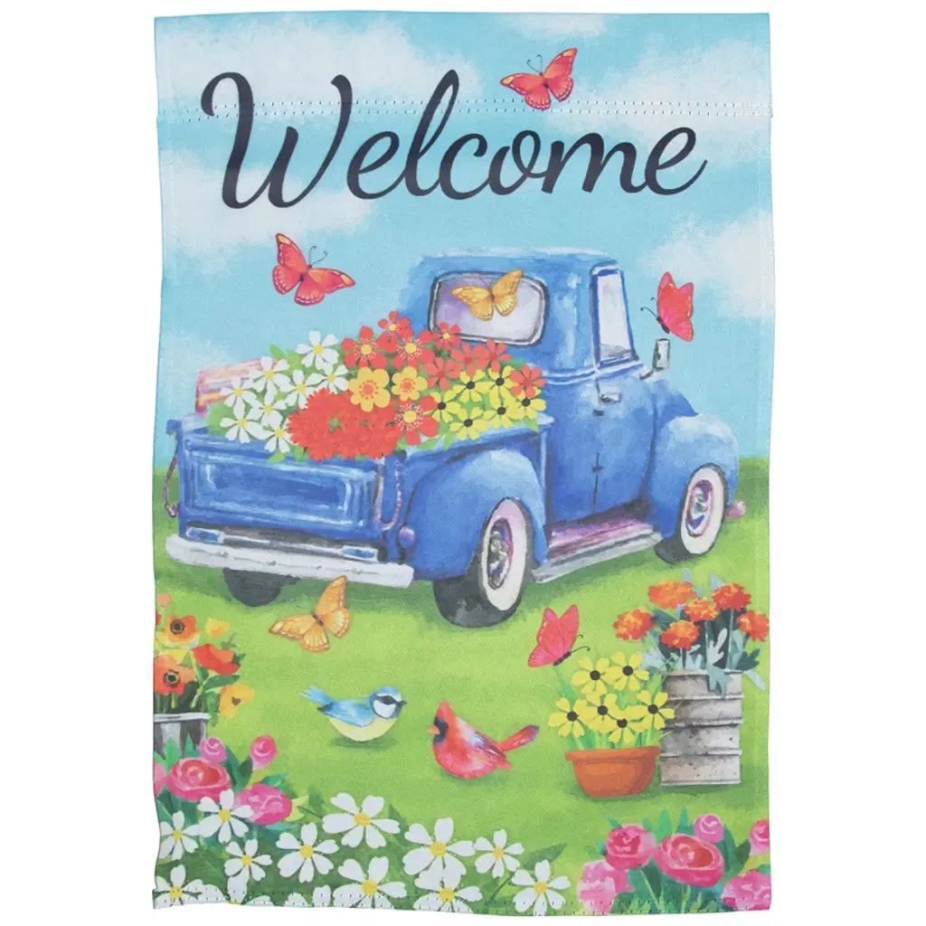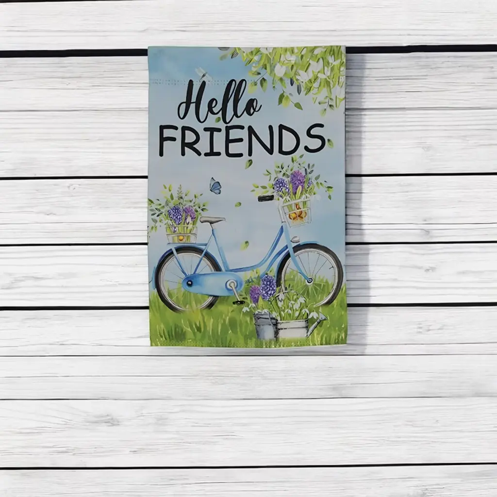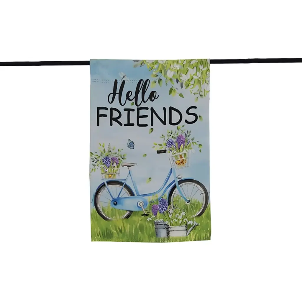 Welcome spring with the Hello Friends Garden Flag, a cheerful and inviting flag that adds a warm touch to your outdoor décor. This flag features a blue sky backdrop with a charming image of a blue bicycle carrying blue and purple flowers. Above the bicycle, the message "Hello Friends" is displayed in bold black letters, offering a friendly greeting to all who pass by. Crafted from 2-ply polyester, the flag is built to withstand the elements, resisting weather, mold, mildew, and UV fading. It includes a convenient loop for easy display on a garden flagpole and is machine washable for effortless maintenance.