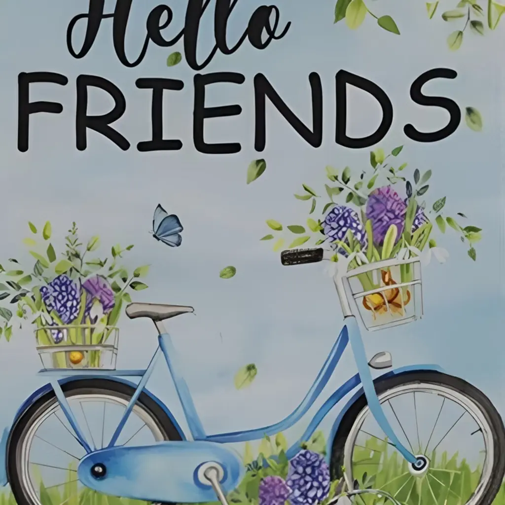 Slickblue "Hello Friends" Flag – Spring Bicycle With Blue And Purple Flowers, 18" X 12.5", Machine Washable