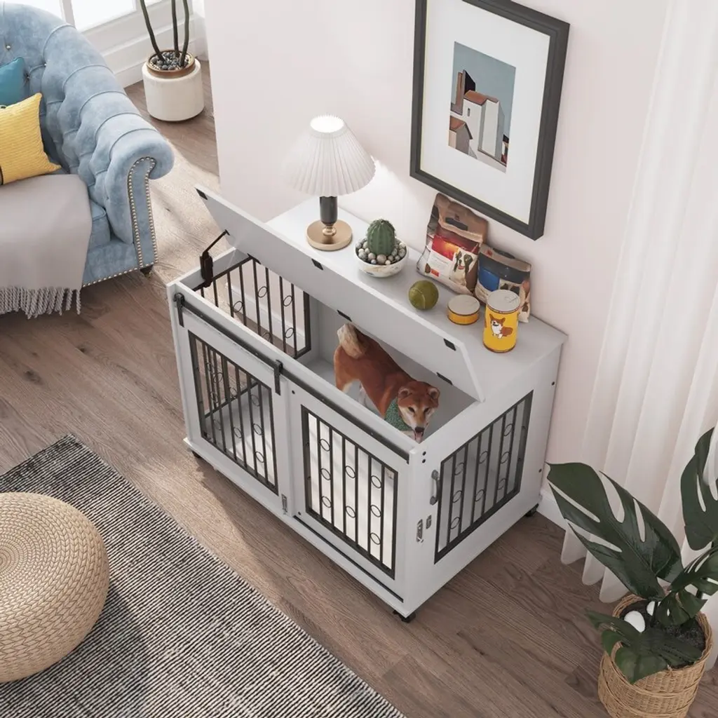 Dog cage with internal partitions, which can keep two puppies, and can also put dog food on the side. You can adjust the position of the divider as your dog grows.The divider can also be removed to accommodate a large dog when you don't want the middle divider.The front of the dog cage adopts a sliding door to save space, and the side door can ensure the entry and exit of two puppies at the same time.The flip top plate lets you play with two puppies at any time and observe them.This crate uses 0.3 inch thick iron pipe and is equipped with iron rings, which make it stronger and have a unique shape.This crate has pulleys on the bottom so you can easily transfer it anywhere, or you can lock the pulleys to keep it in place.