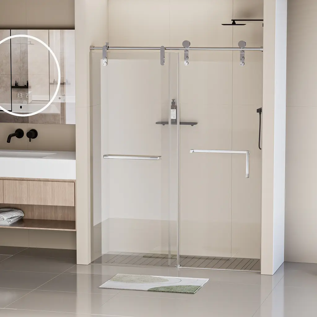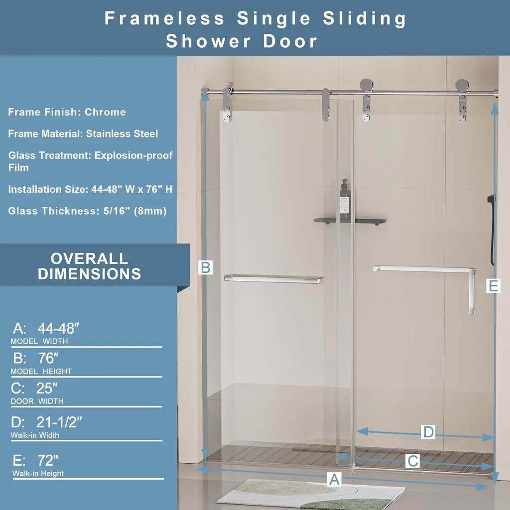 Enjoy a contemporary bathroom upgrade with our frameless single sliding shower door, adding elegance to any space.Crafted with high-quality stainless steel frame material and a chrome finish, ensuring long-lasting performance and resistance to rust and corrosion.The explosion-proof film on the glass surface provides added safety and peace of mind, minimizing the risk of accidents and breakage.With an installation width of 44-48" (Cuts up to 4" long to fit the width of your shower) and a height of 76", our shower door accommodates various shower sizes, while the 25" door width maximizes accessibility and convenience.