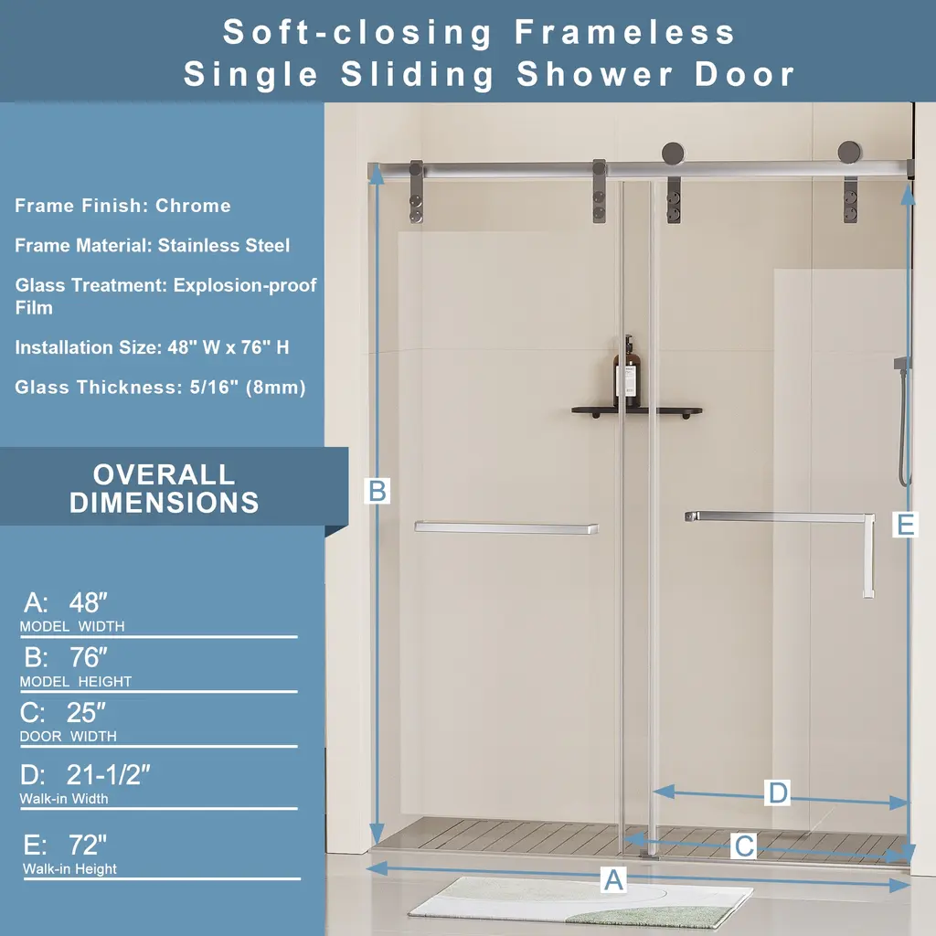 Sliding Semi-Frameless Shower Door - Chrome - 48" X 76"