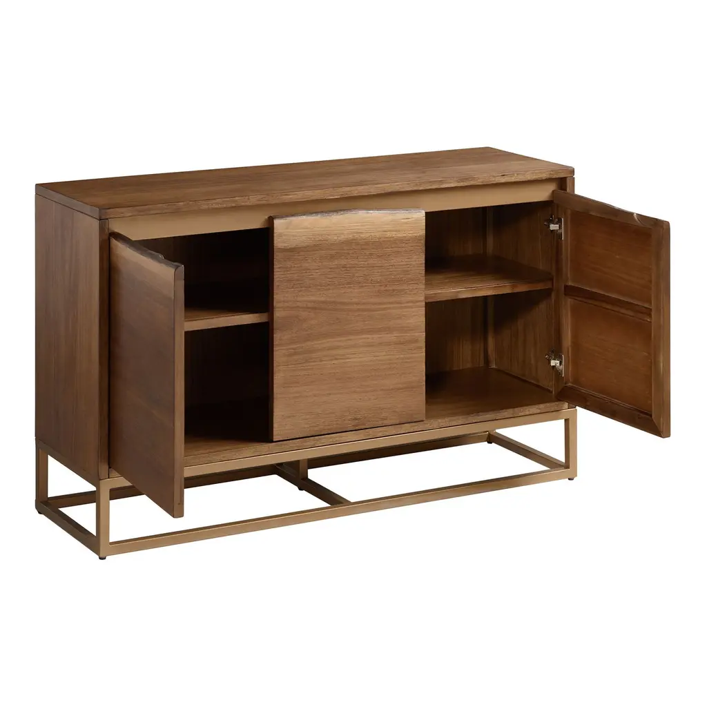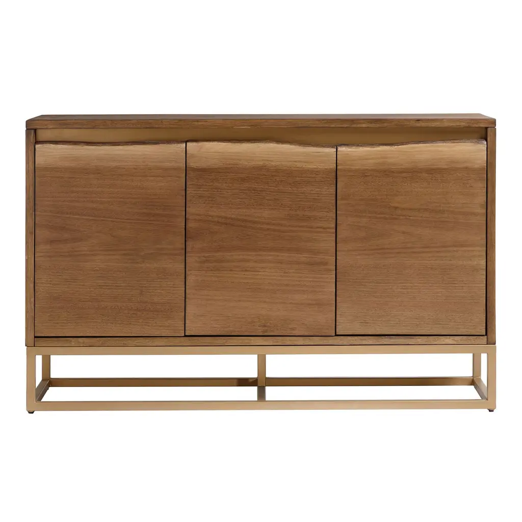 Featuring myriad fine details, a warm caramel finish and an organic live edge across its three cabinet doors, our Sloan sideboard is a thoroughly modern piece. Whether you have an eat-in kitchen, an open loft or a formal dining room, this exclusive buffet provides ample storage space for dishware, linens, and more. Elevated by a metal base in antique gold, its two-tone beauty sets a swanky tone for weekend brunches and dinner parties.