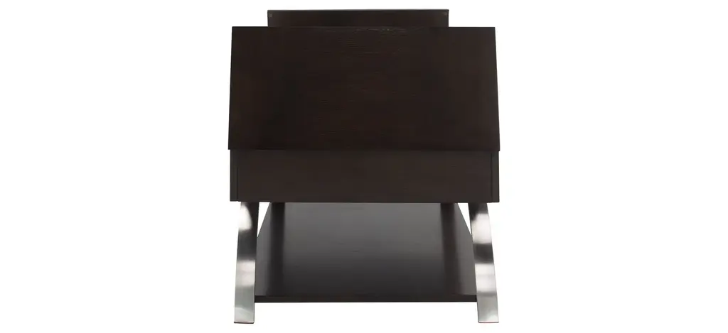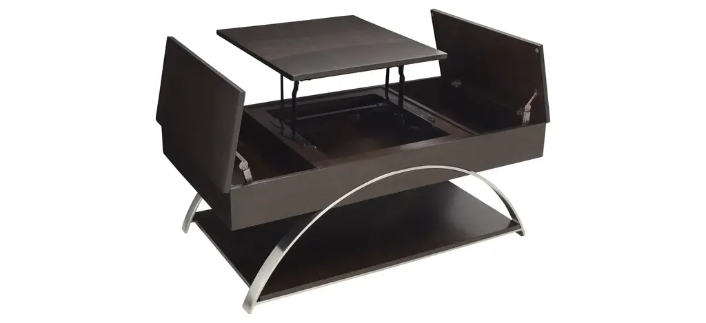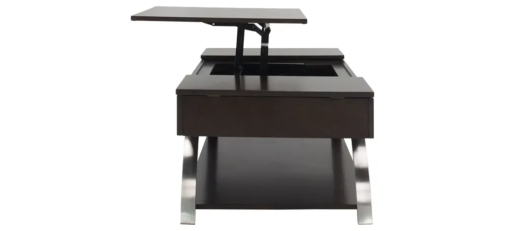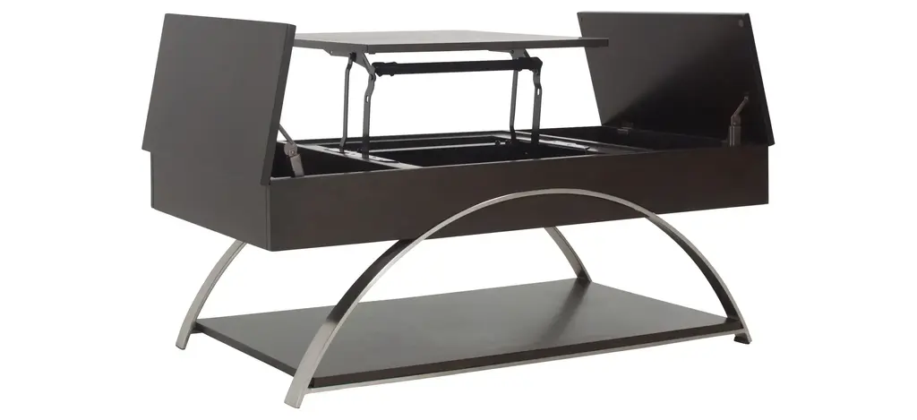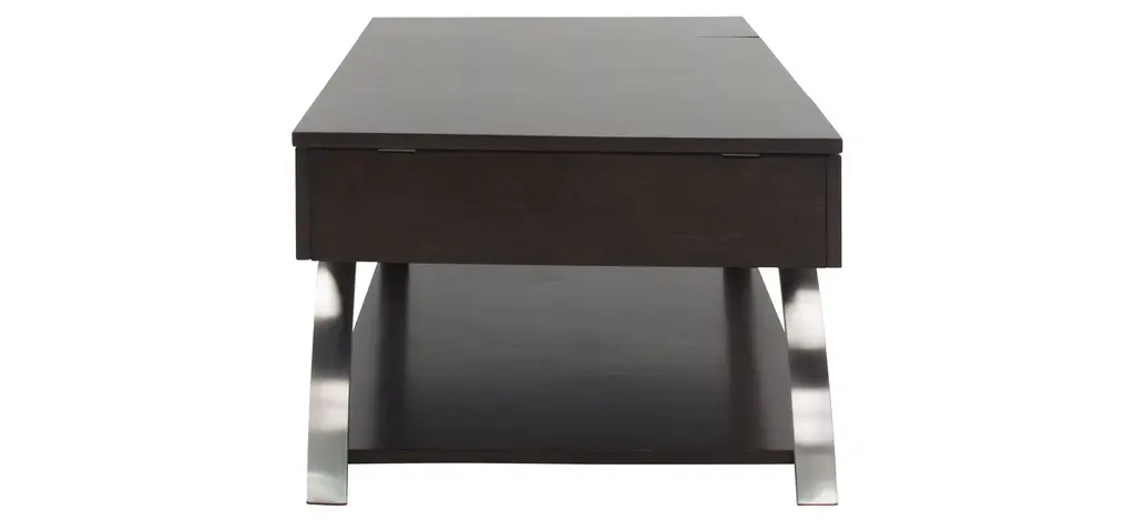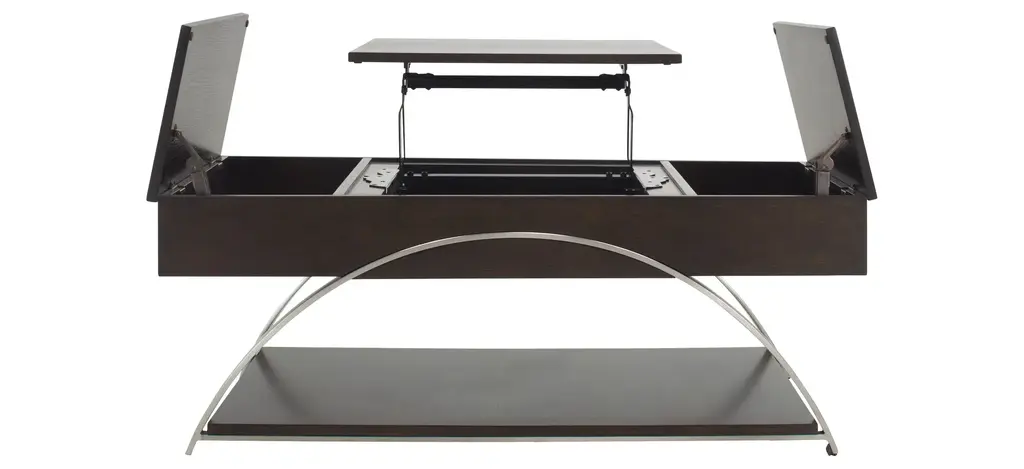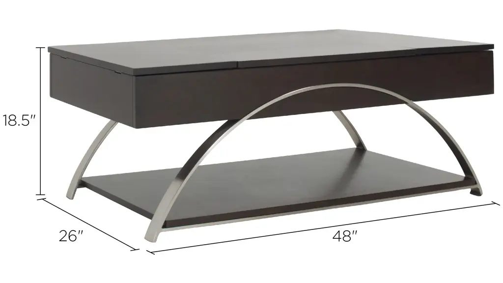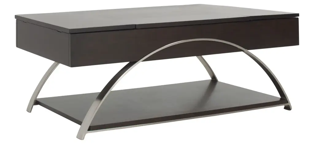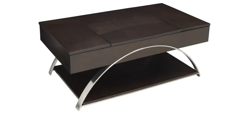 Sleek metal chrome finishes come together with rich, espresso finished wood to create the Sloane cocktail table. The lift-top middle portion combined with the hinged sides reveal three hidden compartments for easy, yet tucked away storage-the perfect fit for any lifestyle.