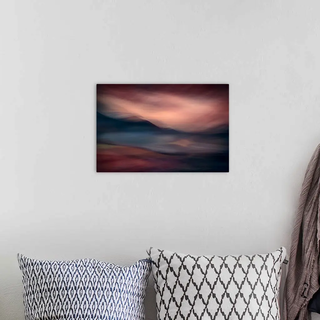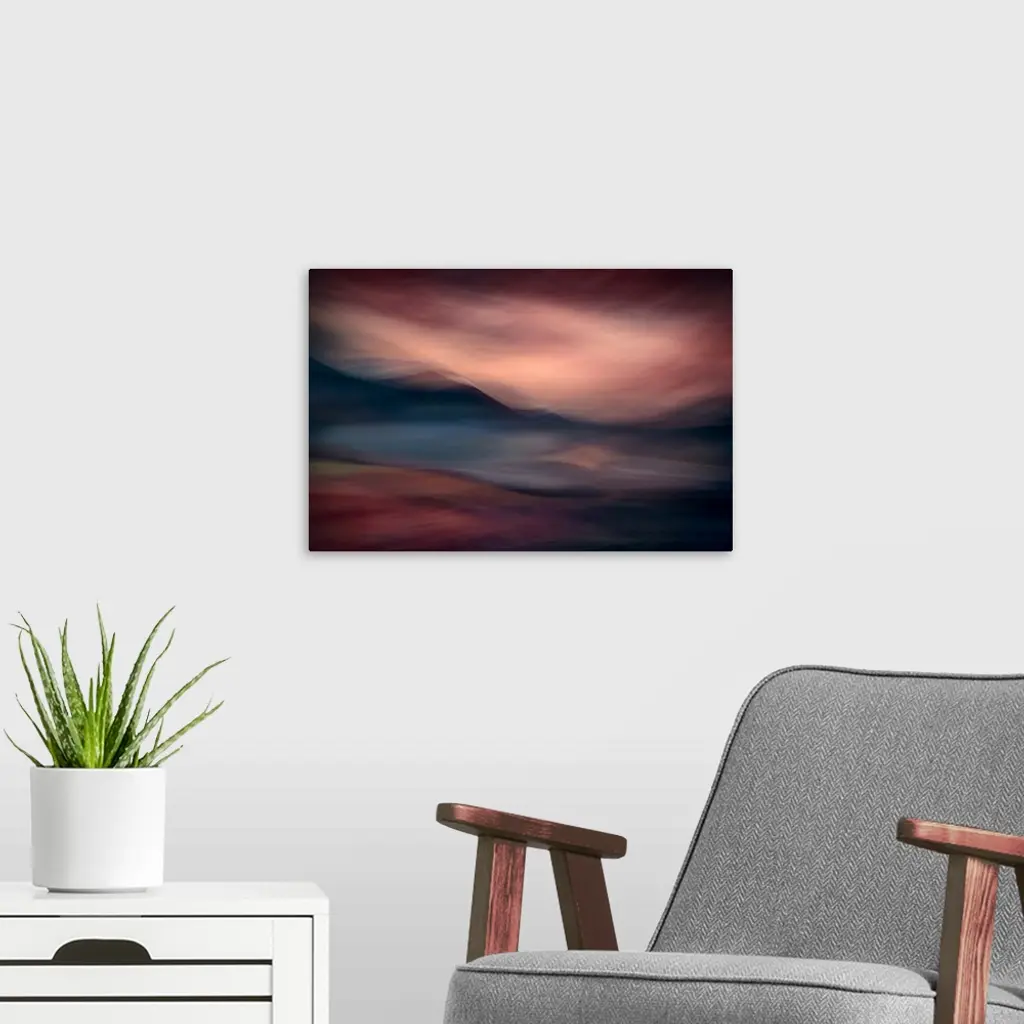 Artistic abstract photograph of a serene lake and mountain scene.