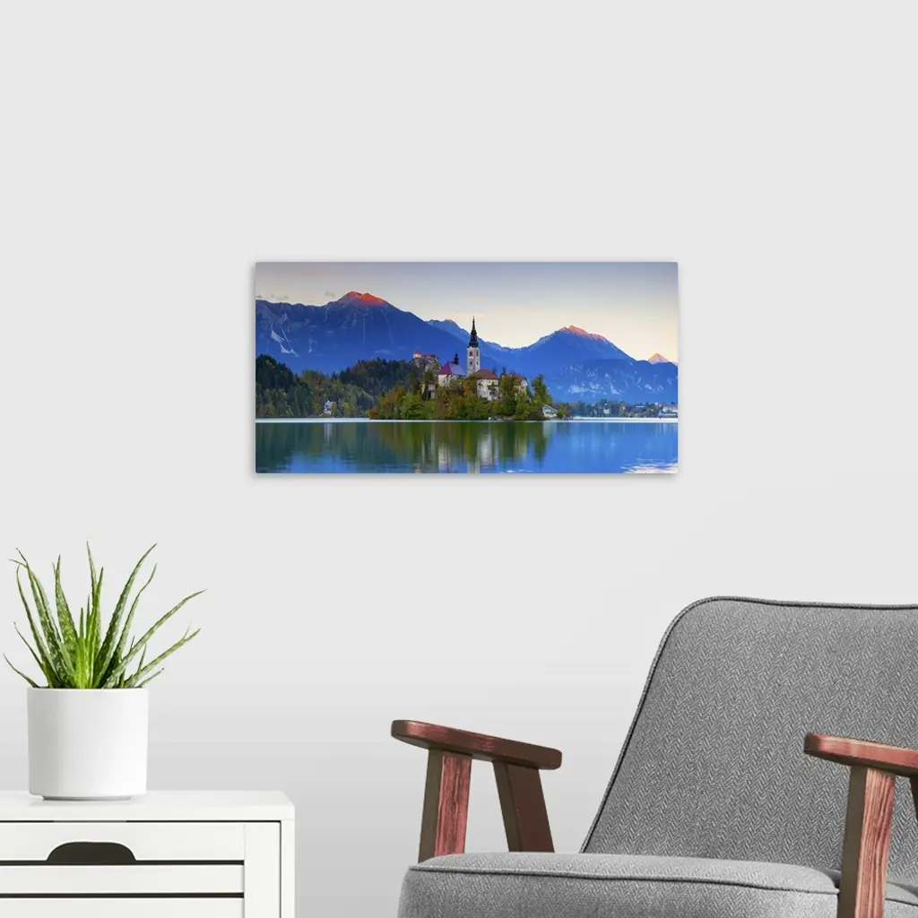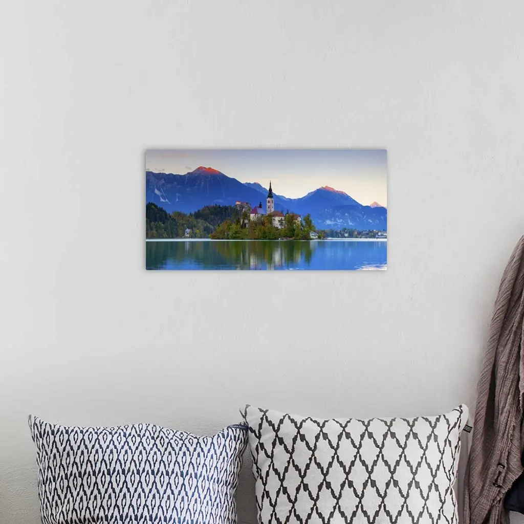 Slovenia, Upper Carniola, Julian Alps, Triglav National Park, Bled, Bled Island with the Church of the Assumption and Bled Castle in the background at sunrise.
